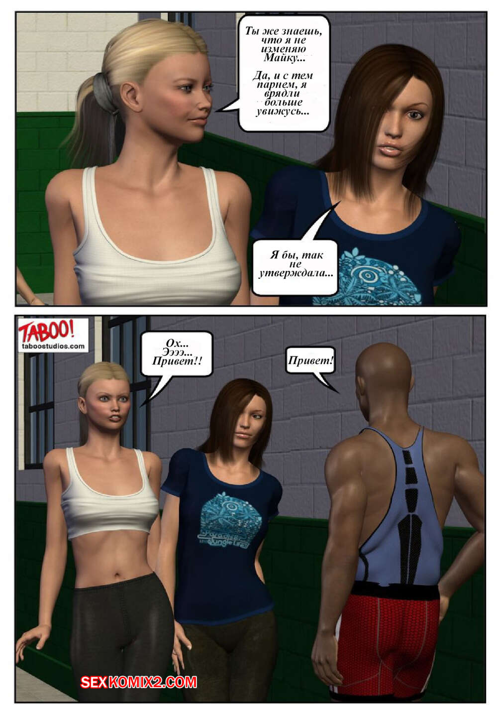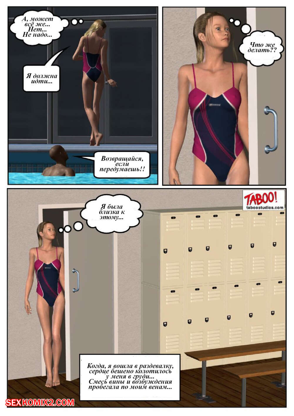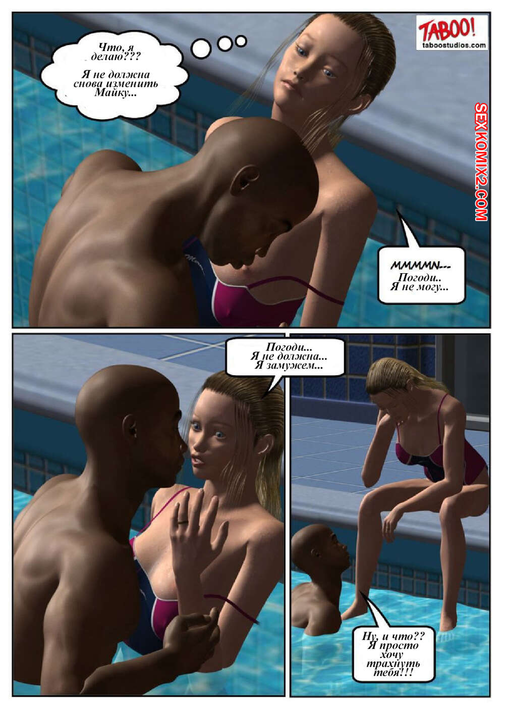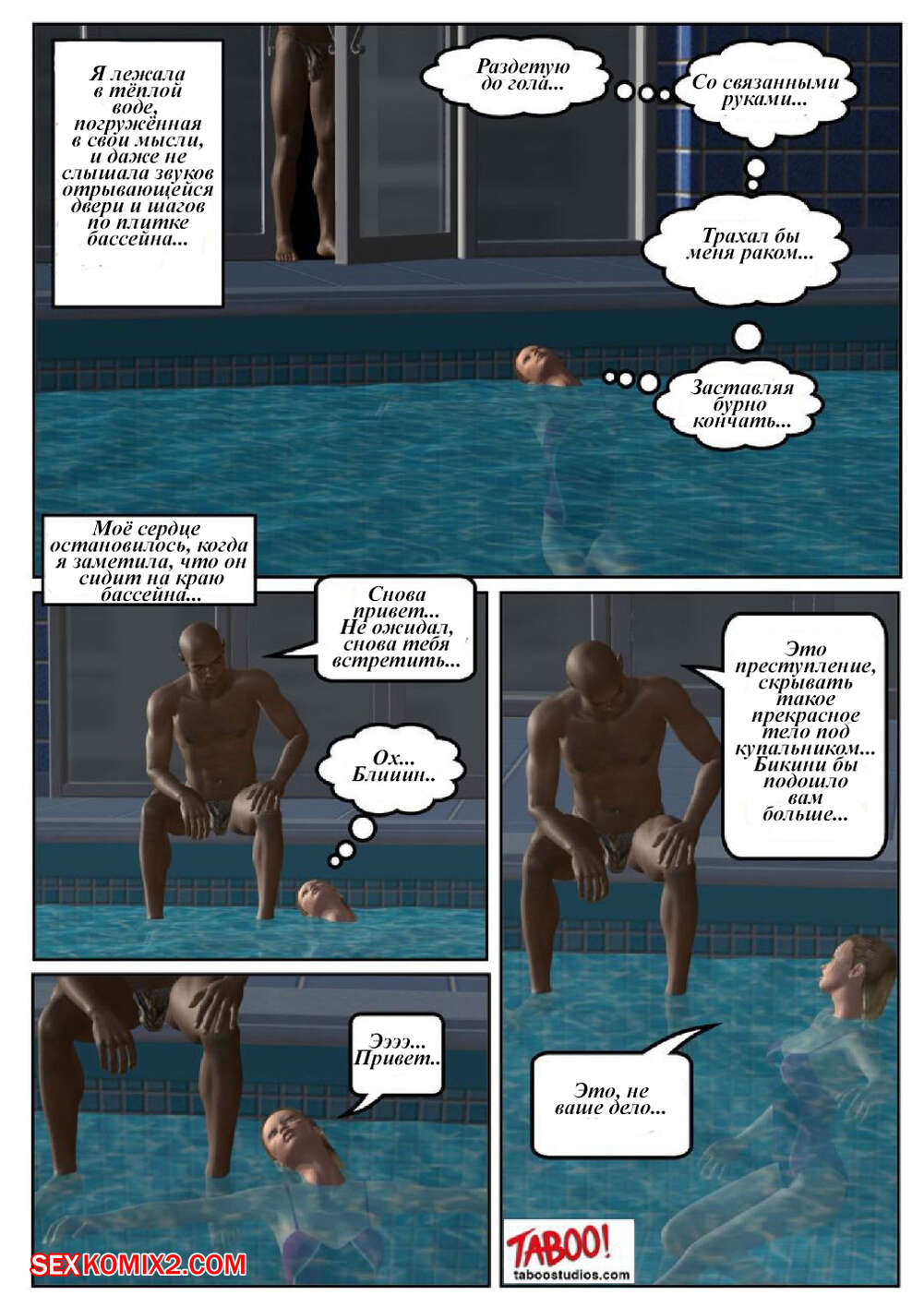 Порно комикс 50 оттенков чёрного. Часть 1 Сисястая милфа блондинка любит трахаться. Она отправилась в бассейн и там ей понравился черный парень. Красотка пошла в раздевалку и стала дрочить свою пизденку, после чего он к ней присоединился.
