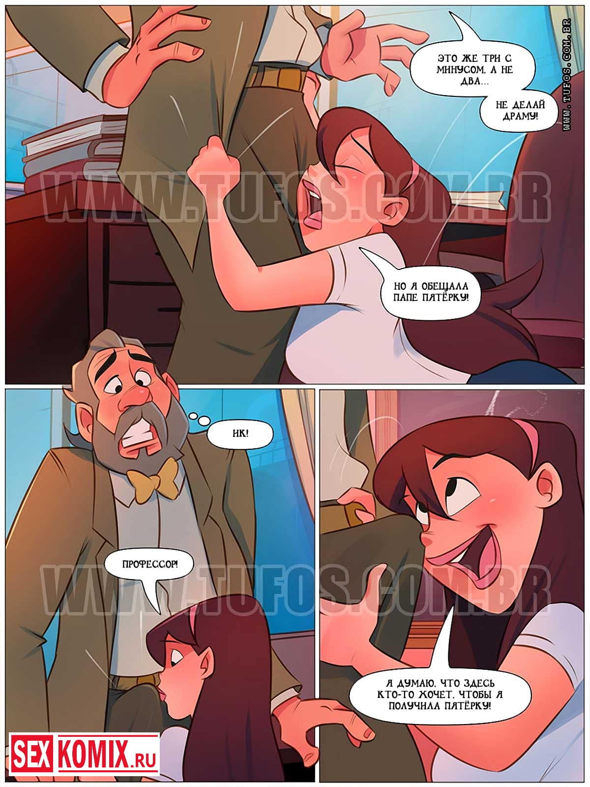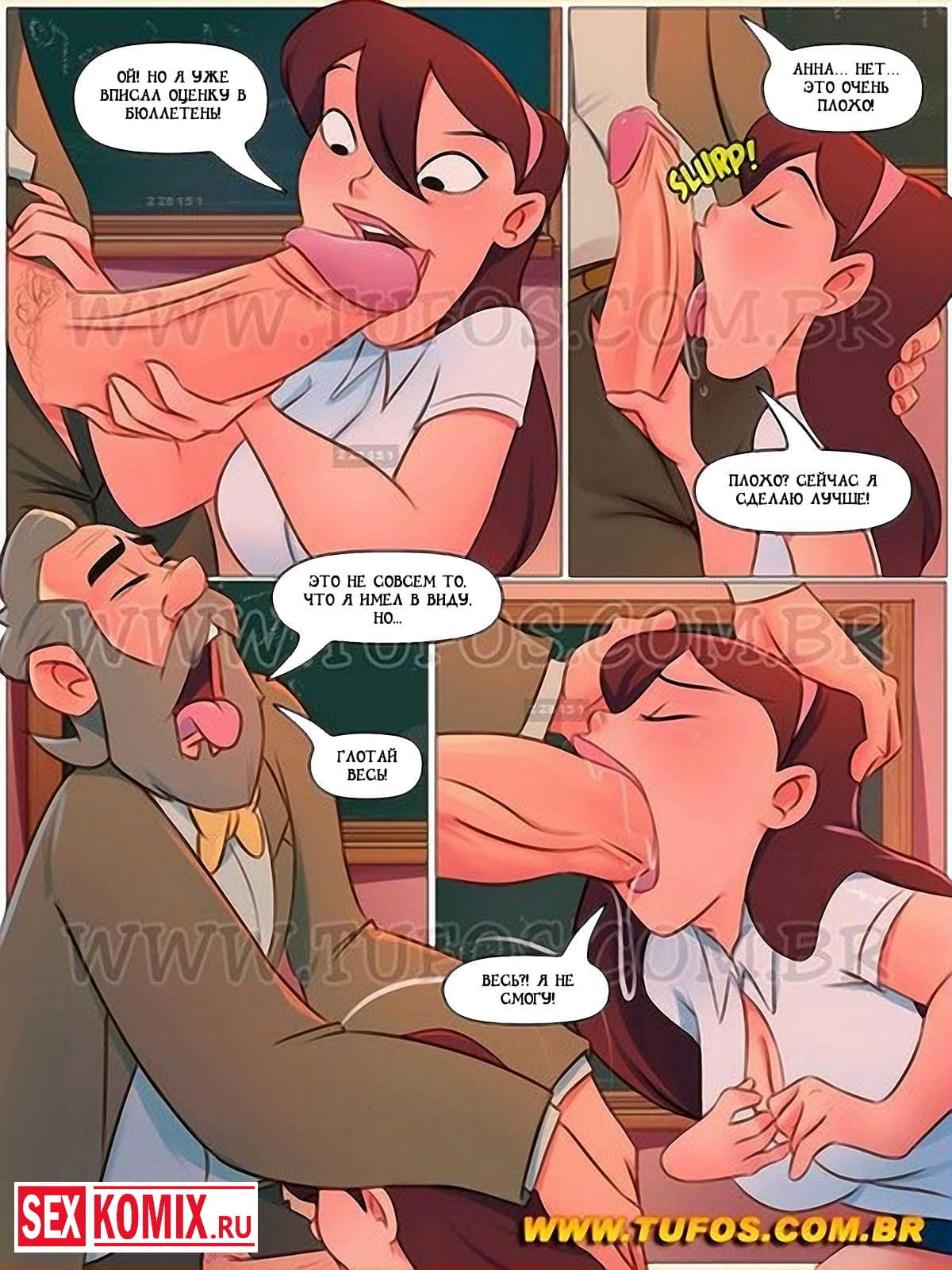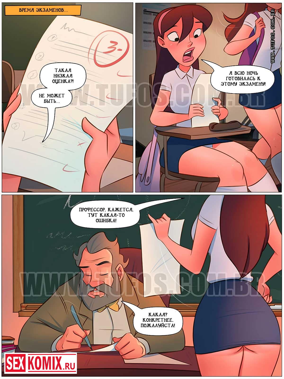 Порно комикс Похотливая семейка. Часть 61. Тройка с минусом. Развратная студентка не могла сдать экзамен и решила воспользоваться другим методом для достижения этой цели. Она попыталась соблазнить своего преподавателя. Аппетитная девушка зашла в аудиторию, когда он был там один и начала крутить перед ним своей симпатичная попкой, и наклоняться, чтобы она выглядывала из-под коротенькой юбочки. Профессор возбудился от такого представления, и решил узнать причину такого поведения. Девушка сказала, что сделает ему отличный минет и разрешить трахнуть себя за то, что он поставит ей хорошую оценку за экзамен, мужчина не смог отказаться от такого заманчивого предложения. Он с радостью трахнул свою студентку.