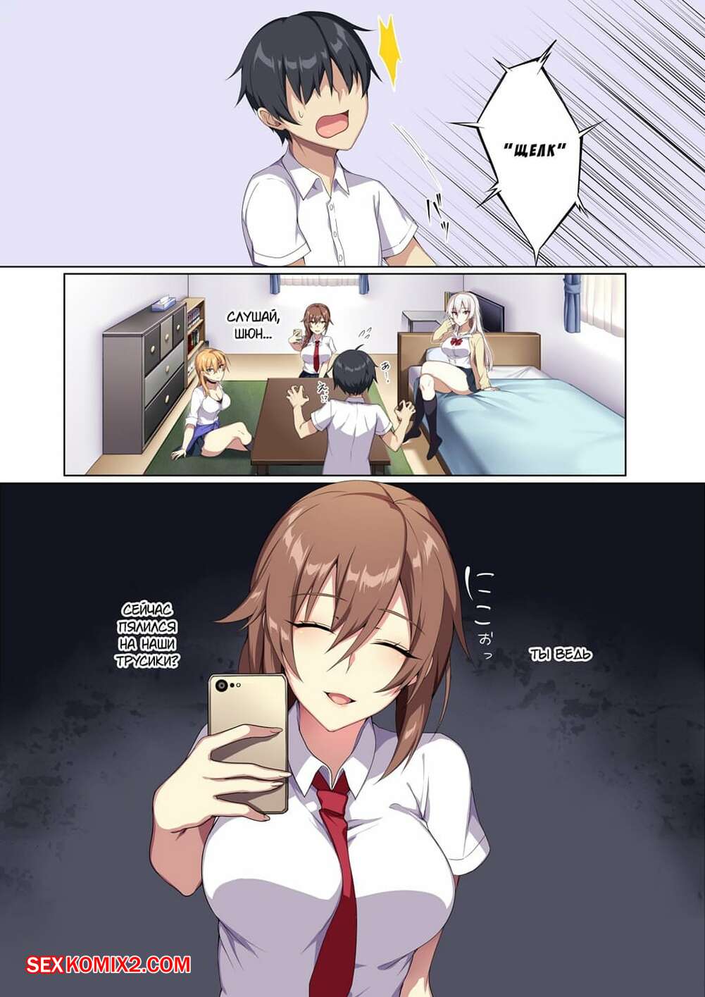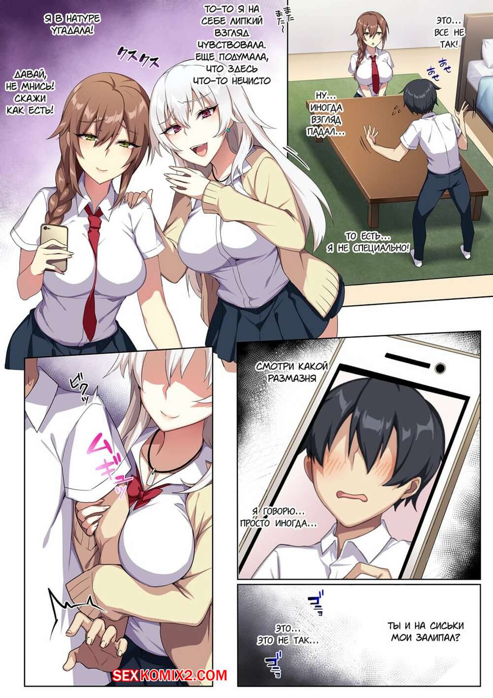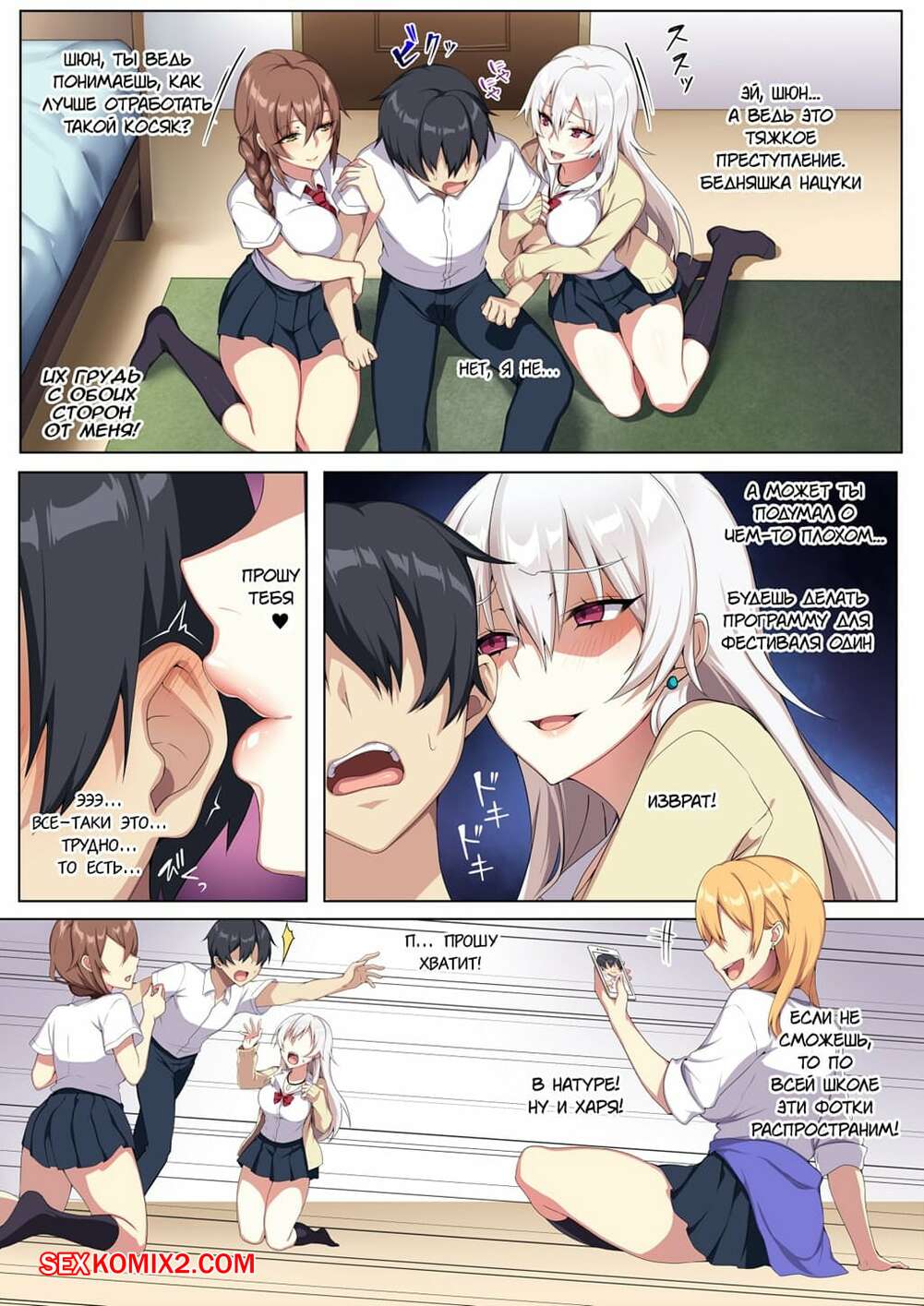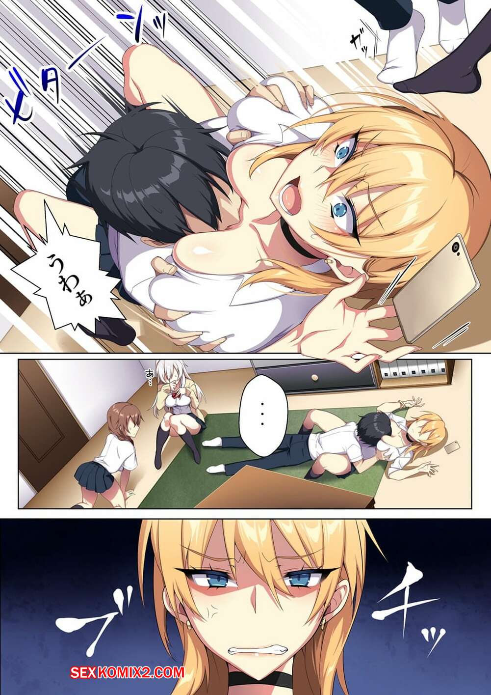Порно комикс Karui Kimochi de Heya ni Ageta Gal to Hamemakuri Горячие сисястые красотки студентки пригласили к себе своего одноклассника, чтобы с ним повеселиться. Сучки разделись и стали сосать его большой хуй, после чего дали ему себя выебать.
