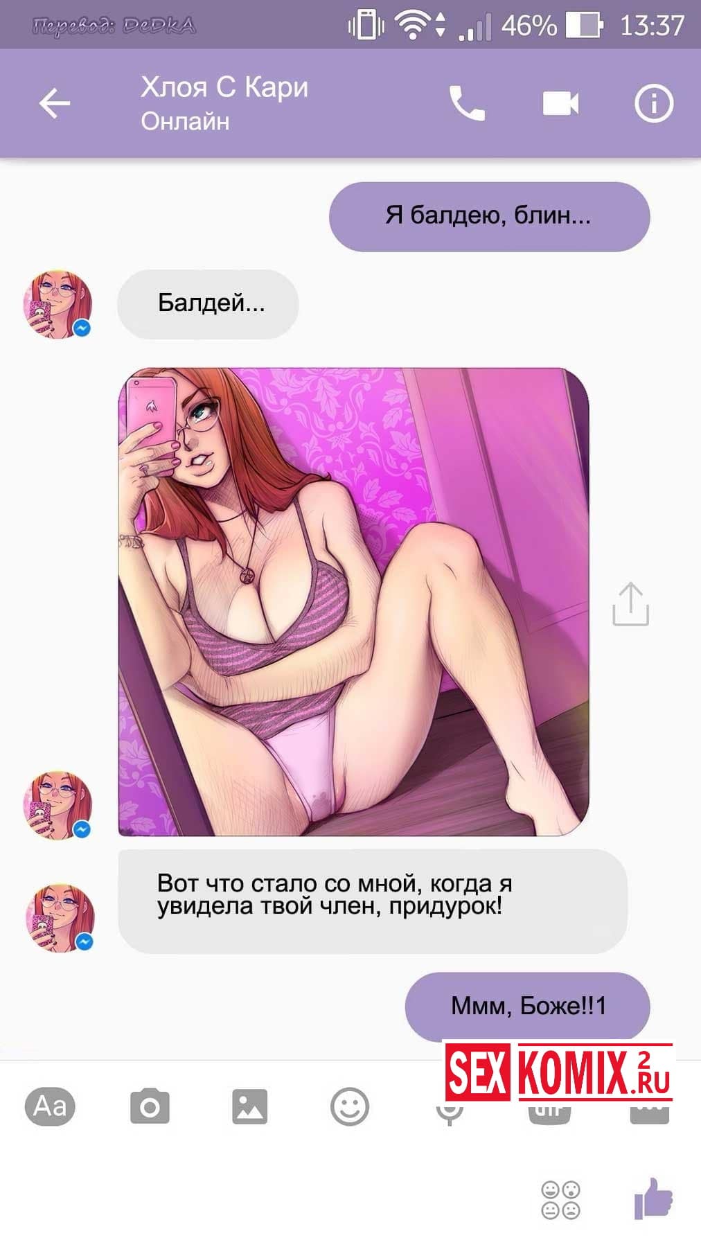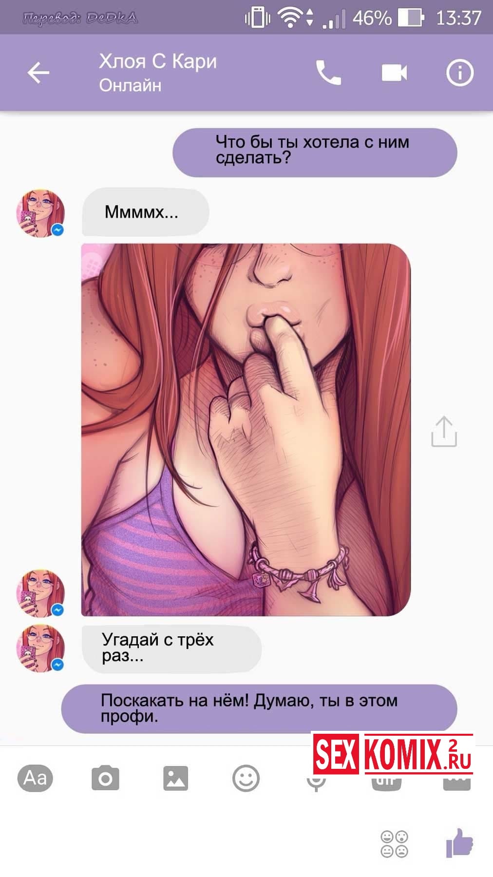 Читайте Порно комикс Чат с Хлоей. Этот секс комикс о развращенной девушке, она переписывается с незнакомцем в секс чате. И парень отправил ей фото своего большого члена и девушка потекла и в ответ начала слать свои обнаженные фотографии. Всю переписку этих ребят вы можете прочитать в комиксе.