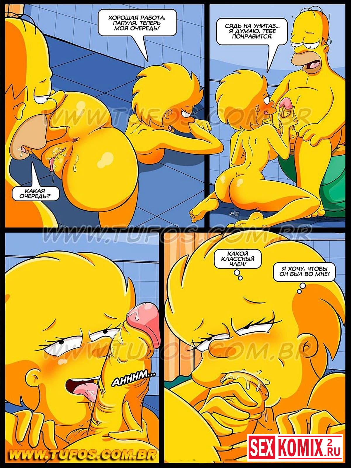 Порно комикс Симпсоны. Часть 2. Футбол и пиво. Порно комиксы Симпсоны от студии Tufos продолжаются! Во 2 части, инцест пародии события начинаются с того, что Гомер и Барт, потягивая пивко, смотрели футбол. Через некоторое время Гомеру припёрло пописать, и он отправился в туалет, где в это время была Лиза. Что произошло в гостиной с Бартом, пока Гомера не было, вы знаете из первой части этого секс комикса, а из этой части вы узнаете, что произошло в туалете.