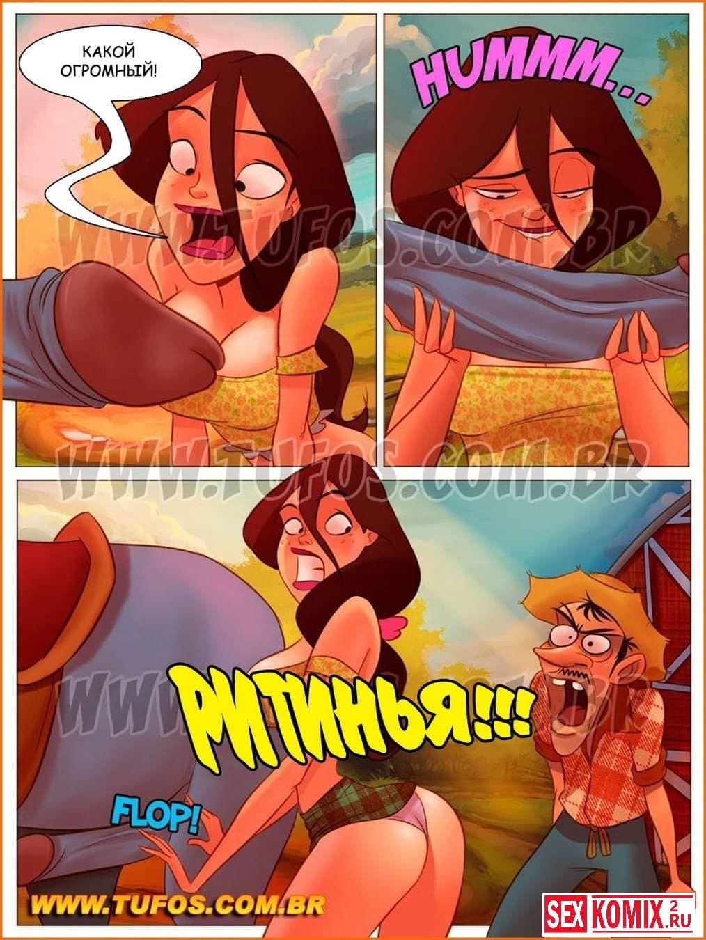 Порно комикс Деревенская семейка. Часть 9. Бесстыдник Жегуин. В этой части секс комикса на русском вы узнаете, как Ритинья захотела вновь покататься на своем ослике, предварительно вычесав его от клещей. Пока она обихаживала животину, у того встал некий интимный орган. Увидев это, Ритинья даже удивилась такому размеру, но тут ее отвлек папаша сеньор Педрао, который все видел, и решил опять воспитать её своим методом, так сказать очень твердым.