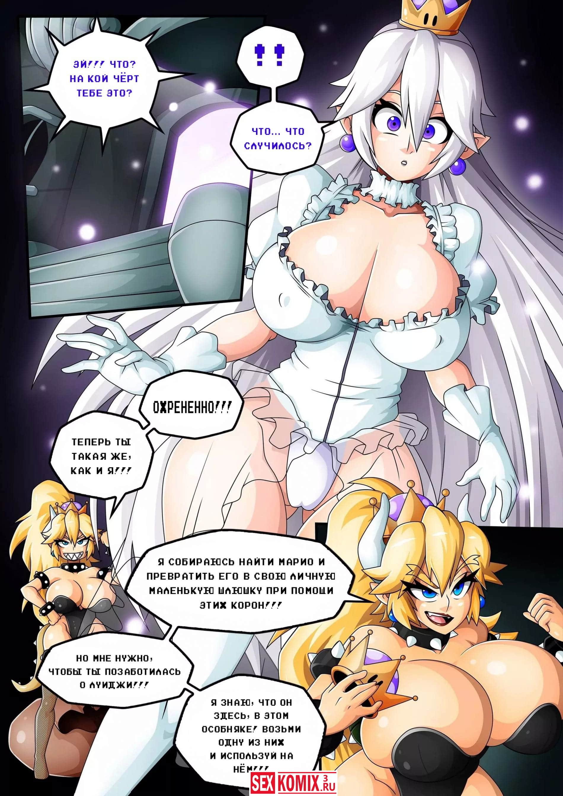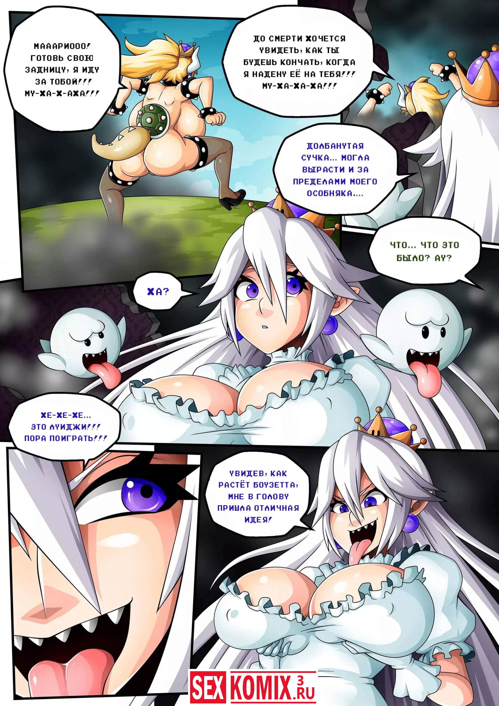 Порно комикс Боузетта. Часть 2. После того как Боузетта залила спермой пизду принцессы Перси она отправилась за братьями Мирио, но перед этим решила обзавестись союзником. Она отправилась к королю Бу, злодейка надела на него супер корону и он тоже превратился в женскую супер версию себя, с большими сиськами и задницей. Девушки разделились и отправились за братьями Марио. Король Бу схватил оного из них и зажал между своих огромных сисек, да так сильно, что тот кончик от такого давления и возбуждения от сочных сисек злодейки.