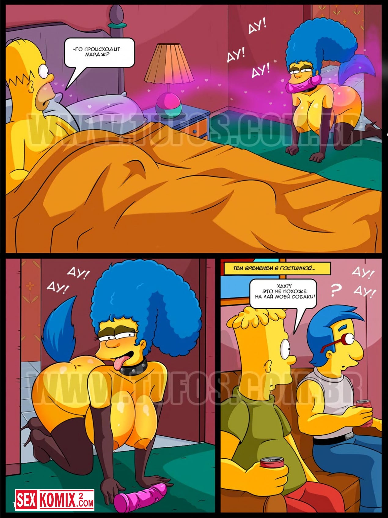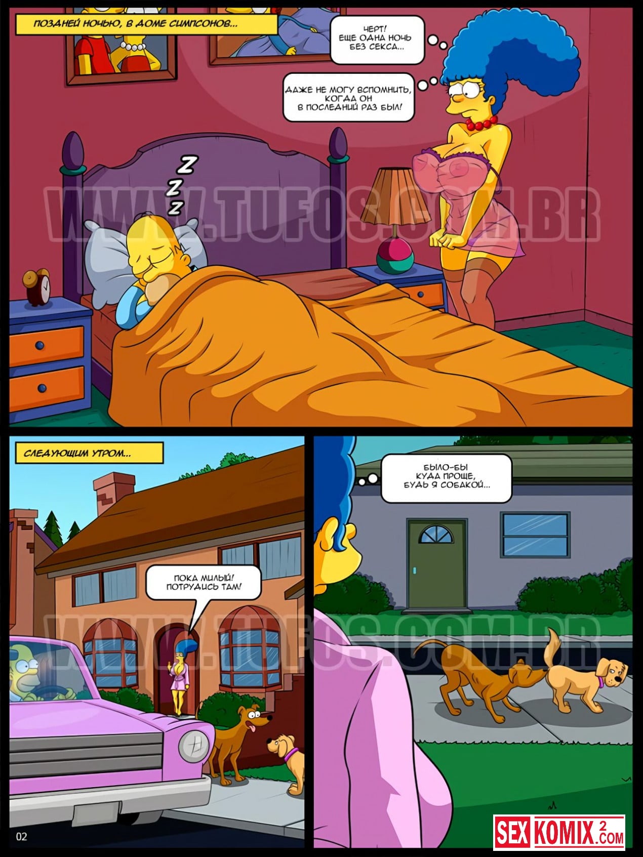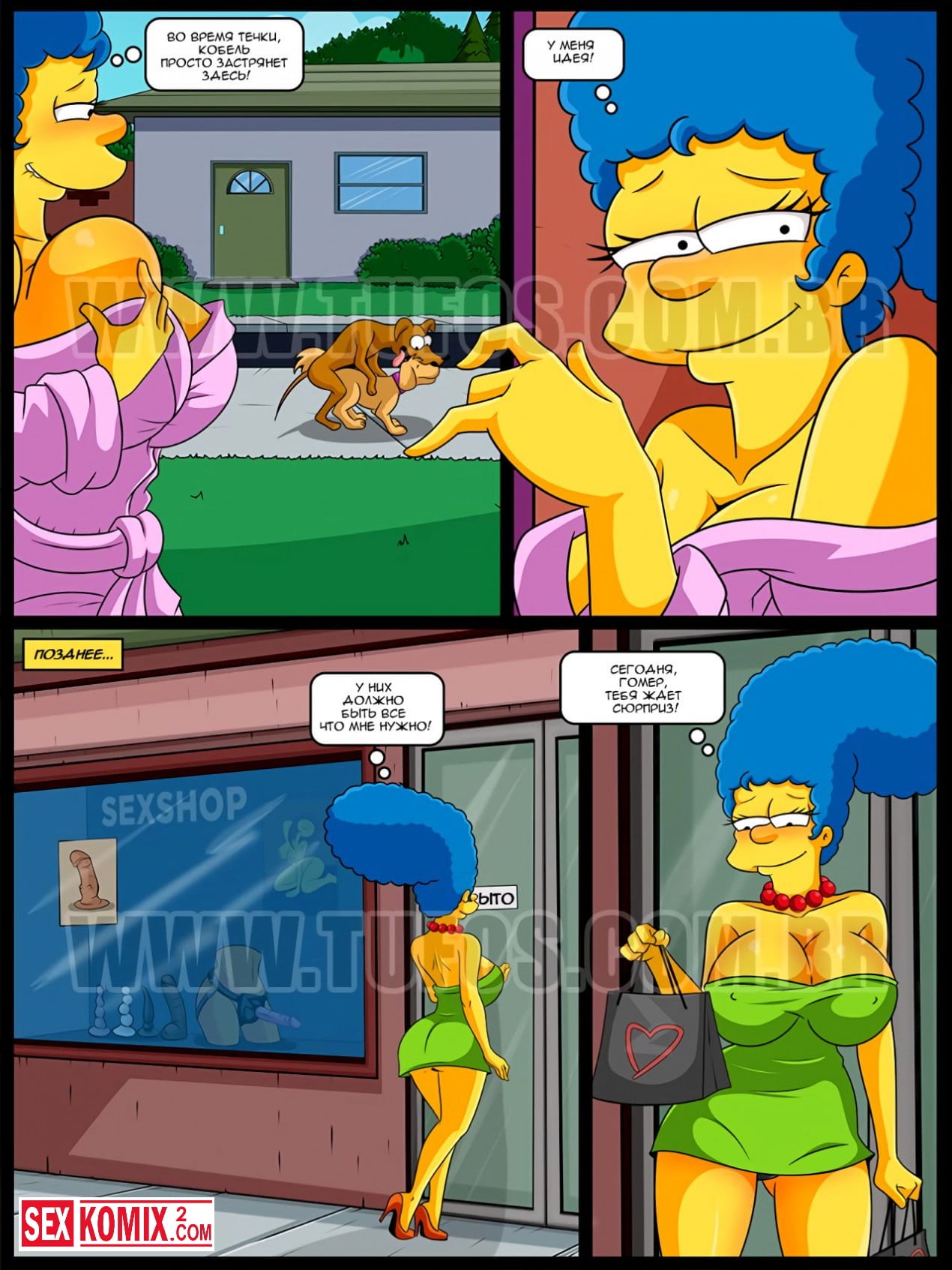 Порно комикс Симпсоны. Часть 18. Сучка. Недовольная отсутствием секса в браке, Мардж, однажды выйдя на улицу видит, как кобель трахает сучку. Мардж жалеет о том, что она родилась женщиной, а не сучкой. И вдруг ей в голову приходит мысль о том, что она может привлечь Гомера тем же самыми, чем сучки привлекают кобелей.