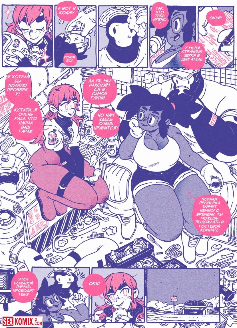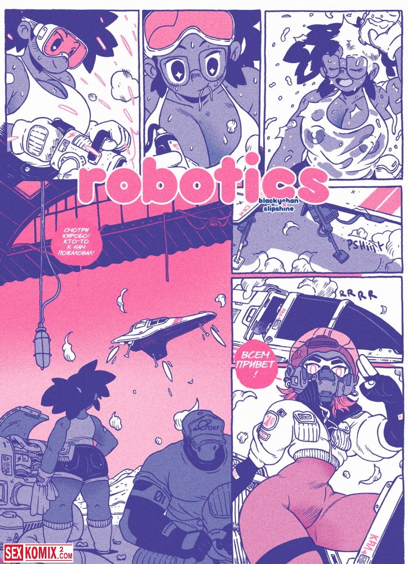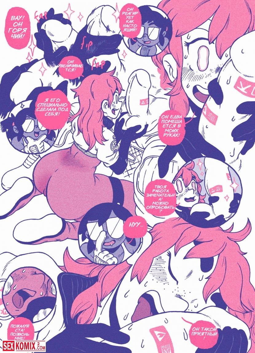 Порно комикс Робототехника. Две сексапильные красотки работают на засекреченной базе учеными по настройке роботехники. К ним поступает большой робот с большим членом. Одна из ученых пытается отрегулировать его настройки и не справившись с работой приглашает вторую девушку для помощи. И тут начинается самое веселье. Девушки сосут его большой член, трогают его. И садятся на него своими кисками.