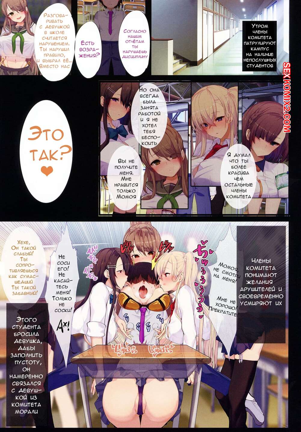 Порно комикс Секрет скрытый в элитной школе морали Горячие сисястые красотки решили повеселиться со своим одноклассником в школе. Красотки стали ласкать его большой хуй, после чего дали ему себя хорошенько выебать.