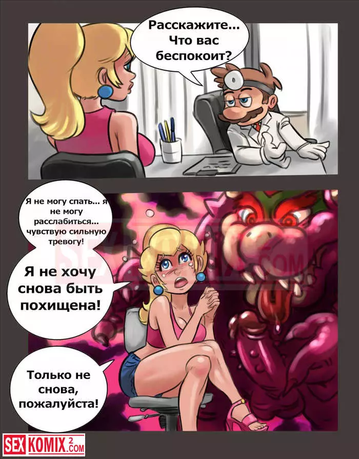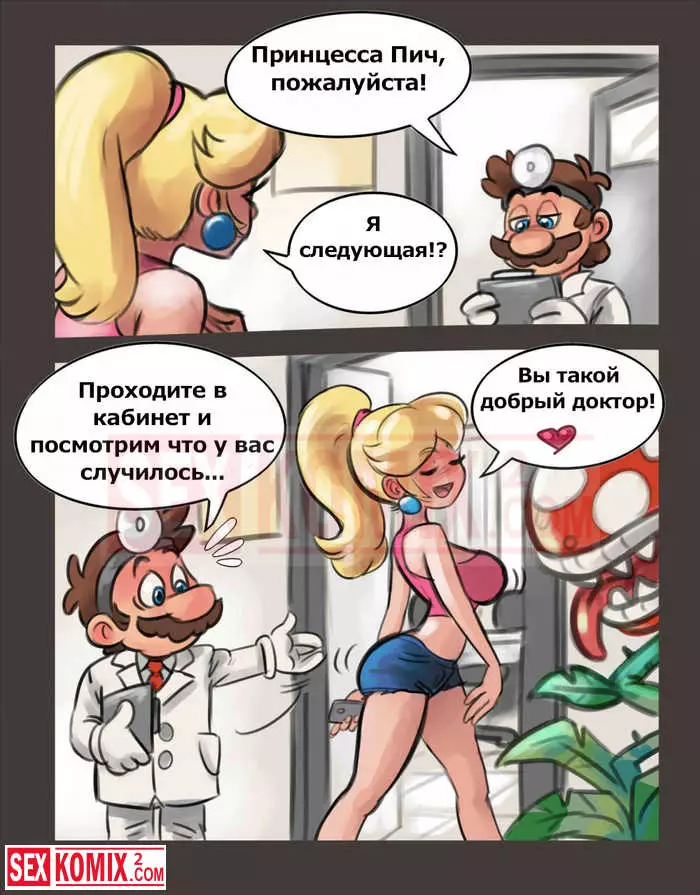 Порно комикс Доктор Марио. Марио нашёл в себе способности психотерапевта и открыл свою клинику. Сразу же к нему на приём записалась очень симпатичная и сексуальная блондинка, которая была принцессой. У нее был очень большой стресс после встречи с огромным драконом. Марио попросил рассказать подробности, что с ней произошло. После её истории он понял, что ей поможет хороший расслабление с помощью секса.