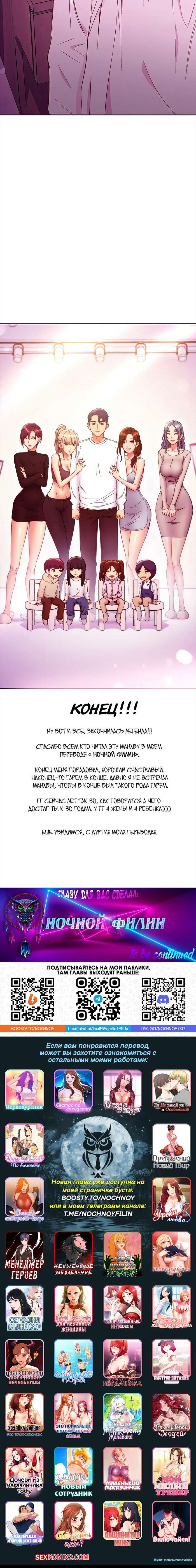 SHARKJK2023-03-13Вот и все, ушла эпоха... Думаю такое шикарное произведение мы встретим далеко не скоро. Спасибо авторам и здоровья бедному переводчику. Думаю это были отличные 3 года моей жизни, о которых я ни капли не жалею. В данный момент неплохие надежды подаёт тайтл "Стажёр Хэнё", так что буду надеяться, что его не забросят как "Проживание в семье" и "Следи за своей спиной"(последняя кстати от автора этой манхвы). В общем и целом всем хорошего настроения и побольше годный манхв.