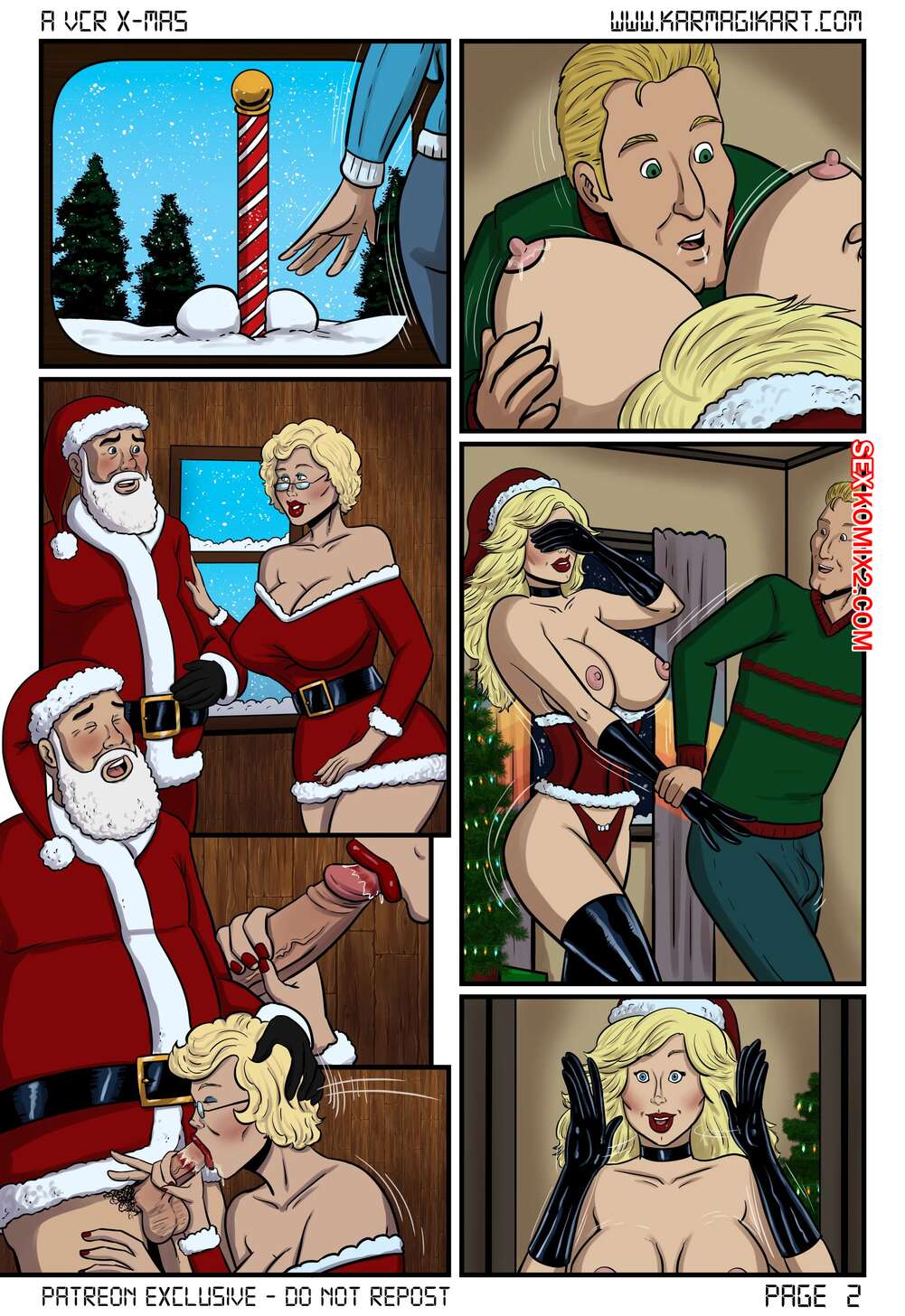 Порно комикс XMas. VCR. Karmagik Сисястая блондинка милфа решила как следует отпраздновать рождество. Она надела сексуальеное белье и стала соблазнять своим шикарным телом молодых парней. Сучка отсосала их большие хуи, после чего дала им себя выебать во все дырочки.