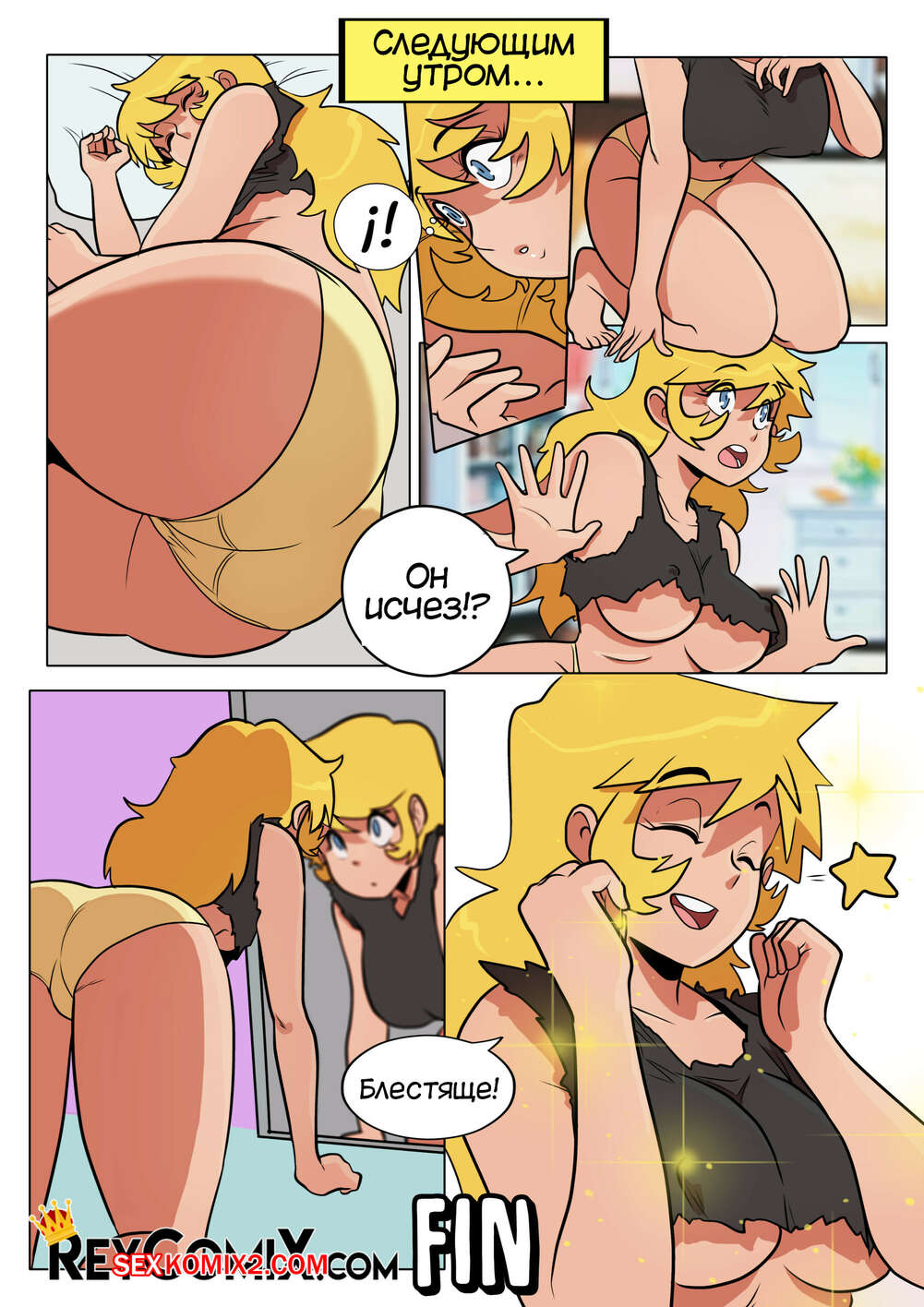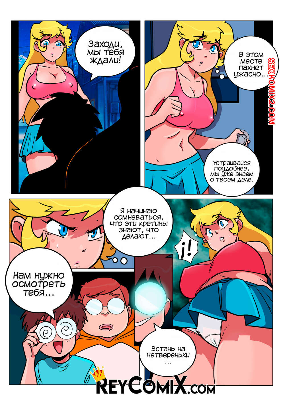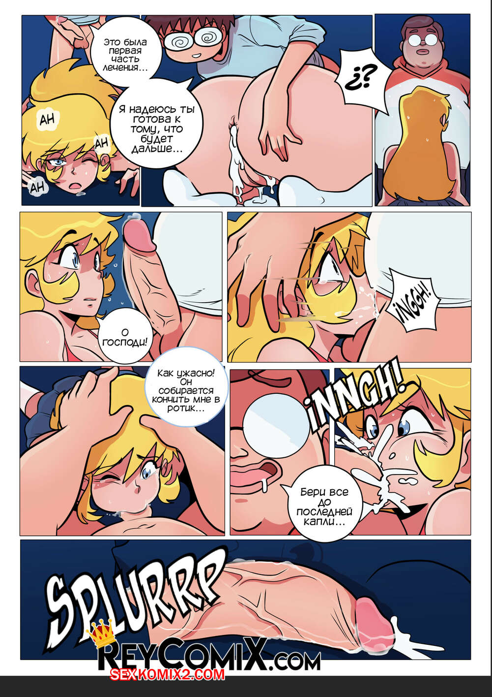 Порно комикс Самодовольный. Средство. Smug. El Remedio. Exclusivo ReyComiX У горячей сисястой блондинки выскочил прыщ перед танцами, поэтому ее подруга отправила девушку к своим знакомым. Там парни раздели сучку и выебали ее во все дырочки, после чего кончили ей на лицо, решив проблему девушки.