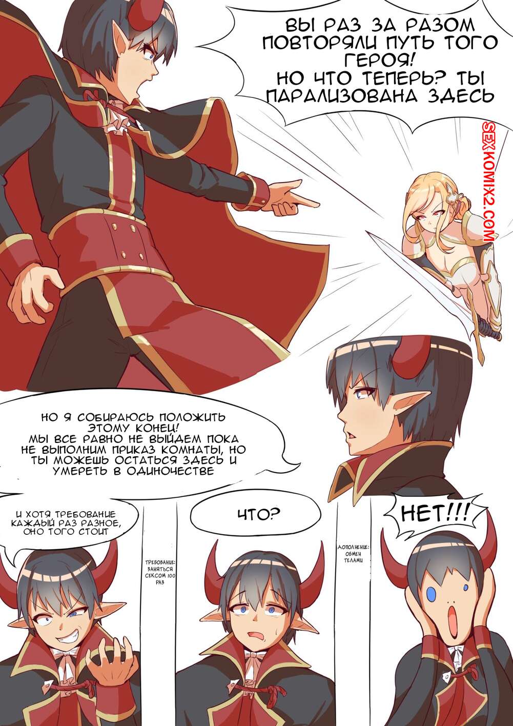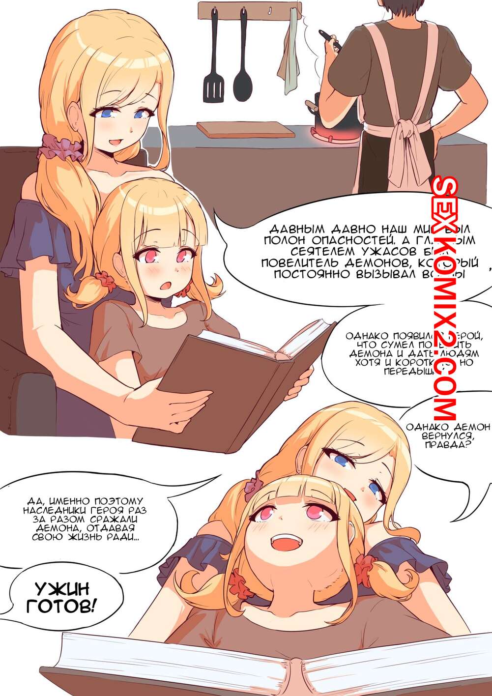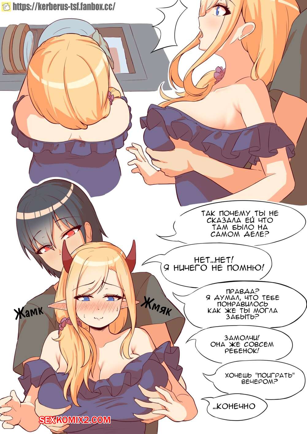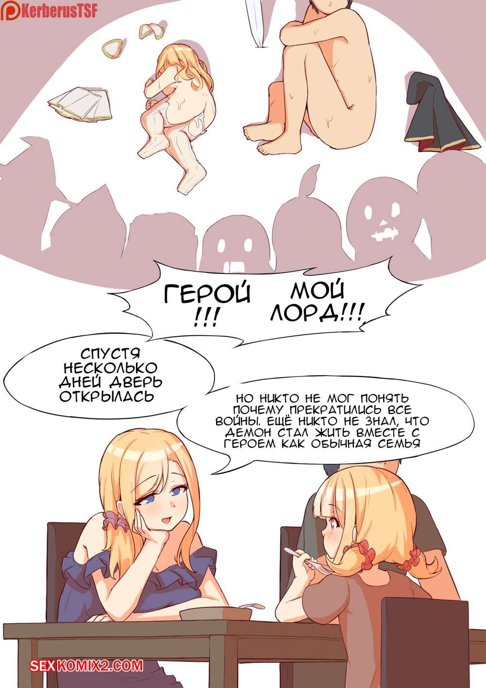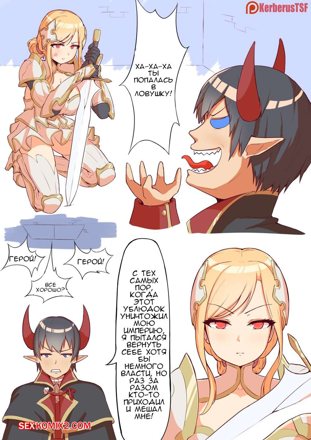 Порно комикс Задание демона. Demon Quest. Kerberus Горячая блондинка читала дочери книгу и в этот момент она вспомнила первую встречу со своим мужем. Красотка начала с ним сражаться, после чего разделась перед парнем и дала ему себя выебать.