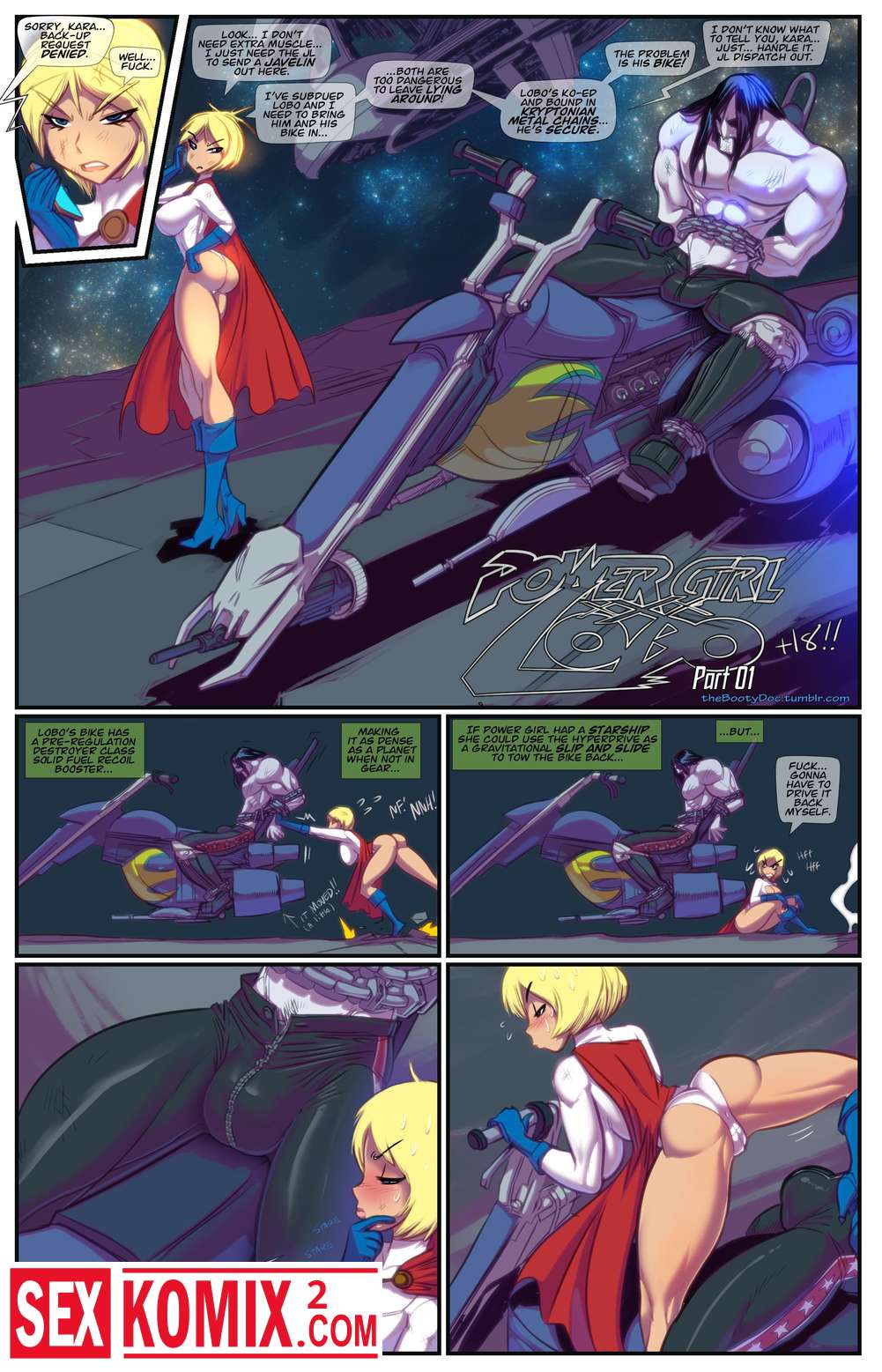 Порно комикс PowerGirl XXX Lobo. Английский. ПоверГерл поймала преступника и связала его на байке. Она уже собиралась вести его полицию но села на его огромный член и забыло что хотела.
