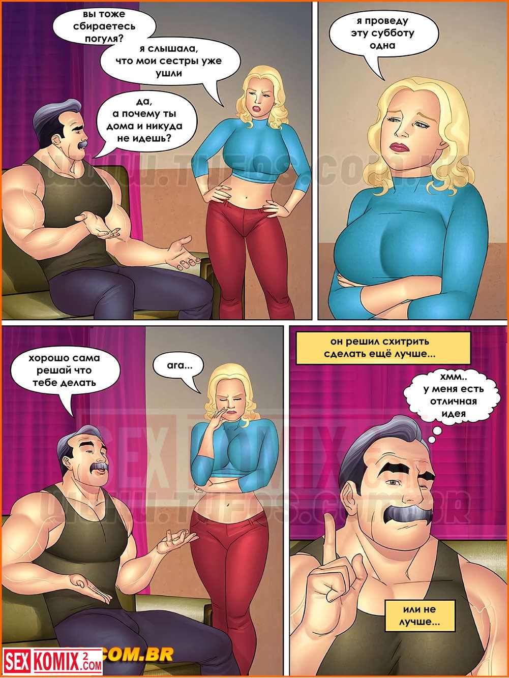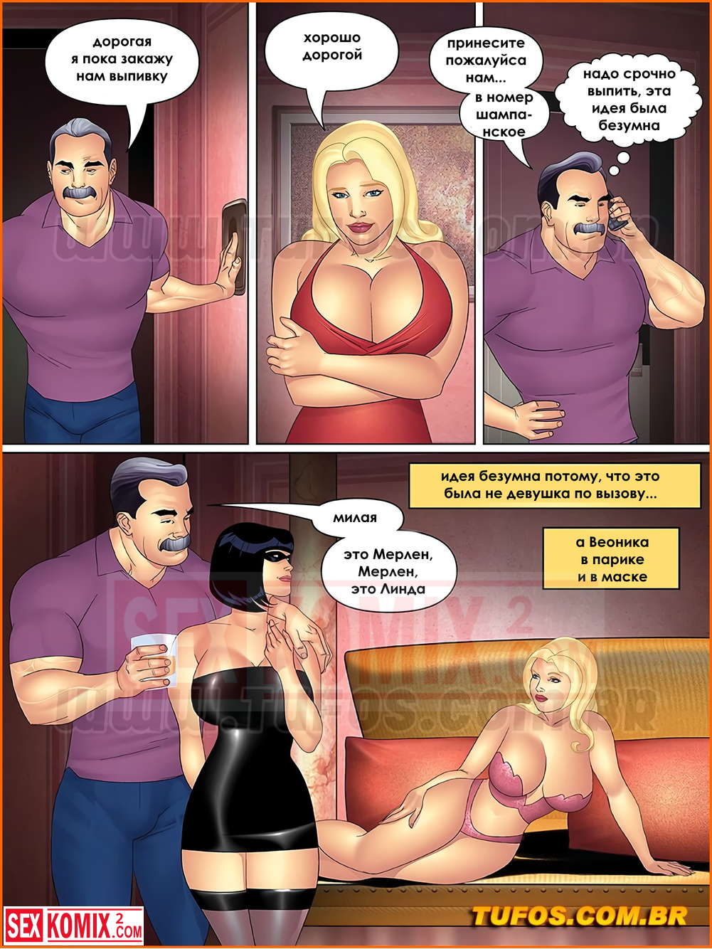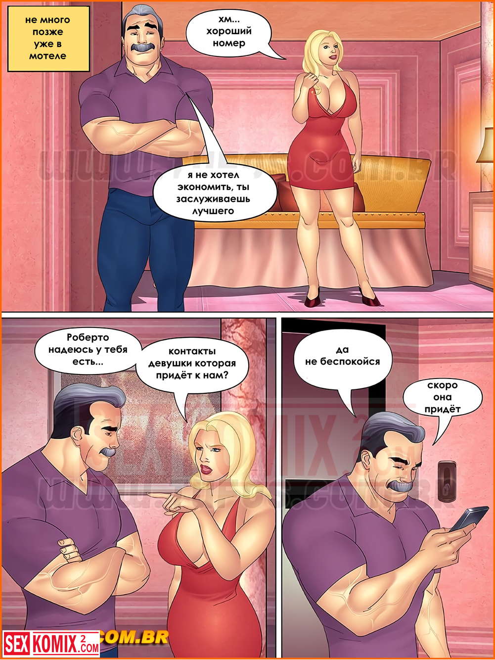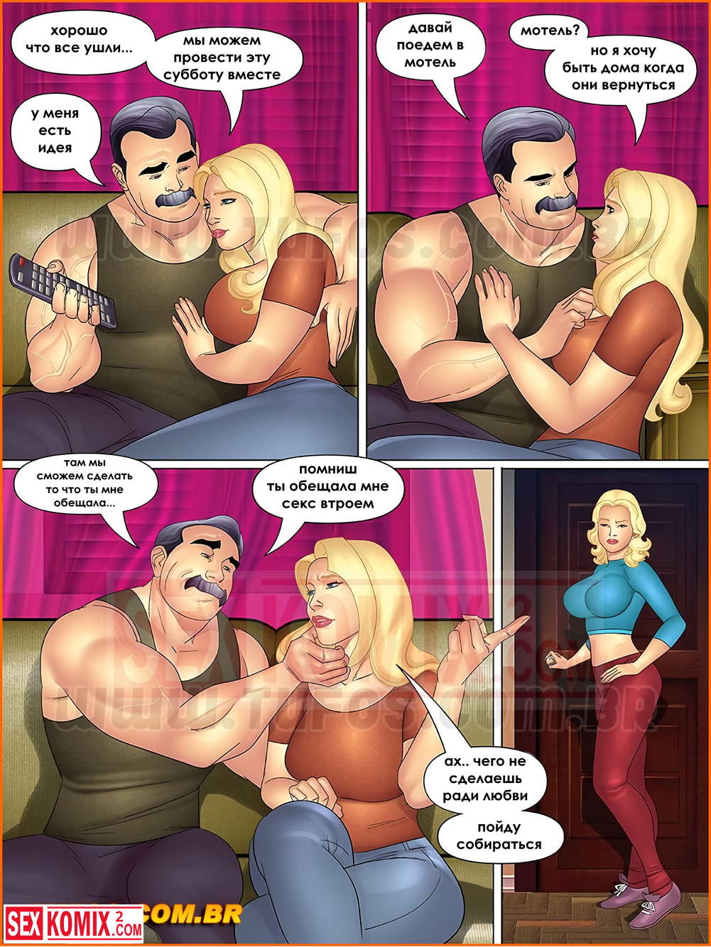 Порно комикс Тетя, кузины и племянник. Часть 14. Секс втроем. Субботним вечером все пошли на прогулку и Роберто решил воспользоваться этим и позвать Линда в мотель для секса втроем. Тем более она ему давно это обещала.