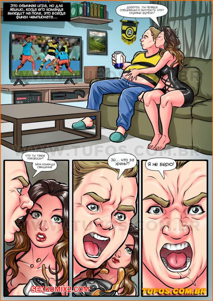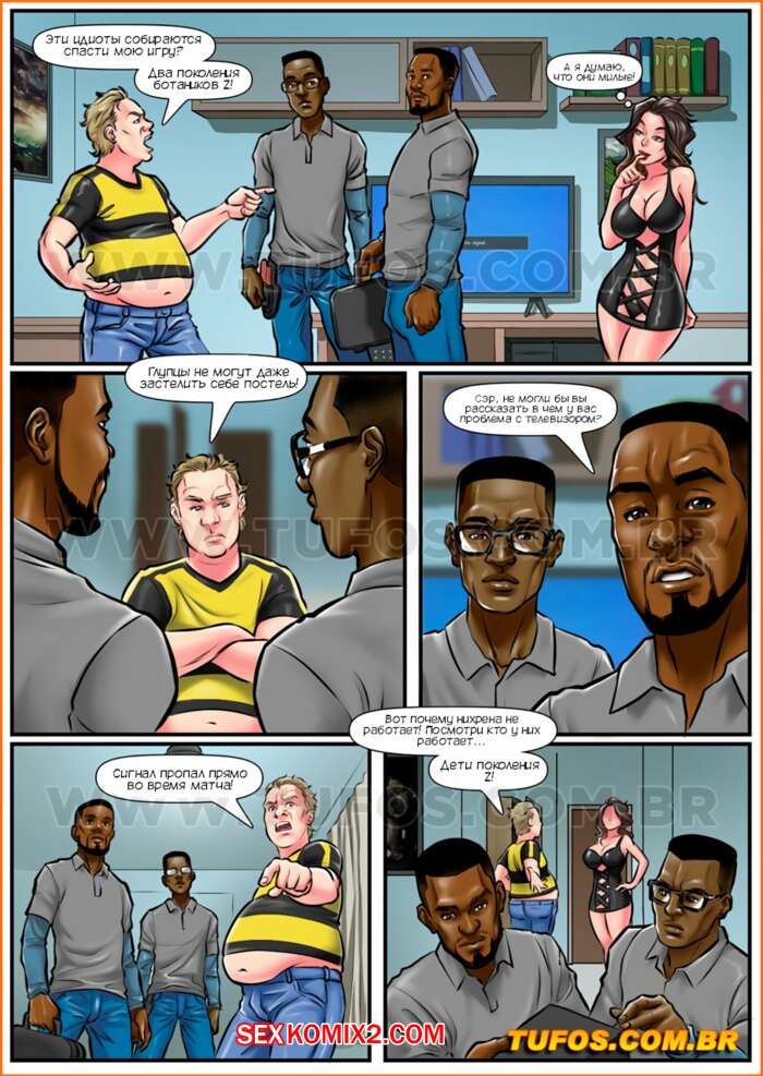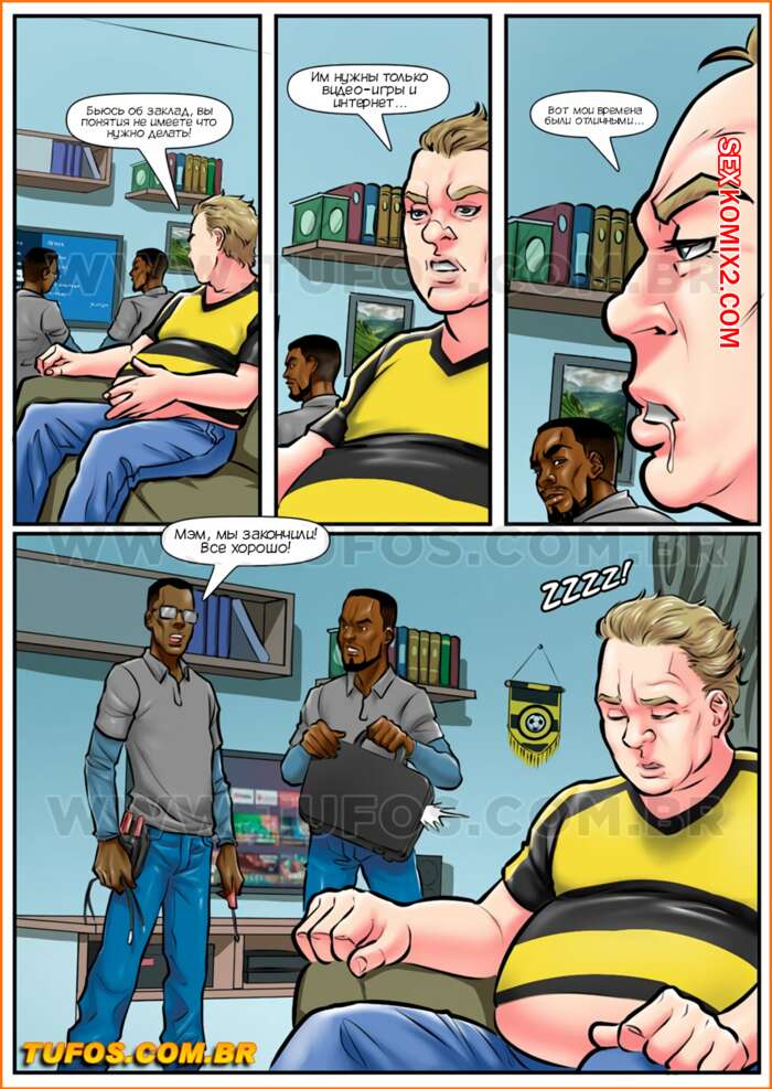 Порно комикс Анаконды. Часть 10. Поколение Z. Anacondas. Tufos Сисястая милфа брюнетка хотела трахаться, но ее муж совсем не обращал на нее внимание. Красотка решила повеселиться с двумя темнокожими парнями, которые чинили телевизор, и дала им себя выебать во все дырочки.
