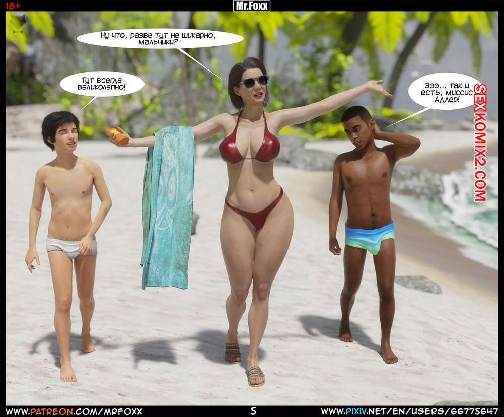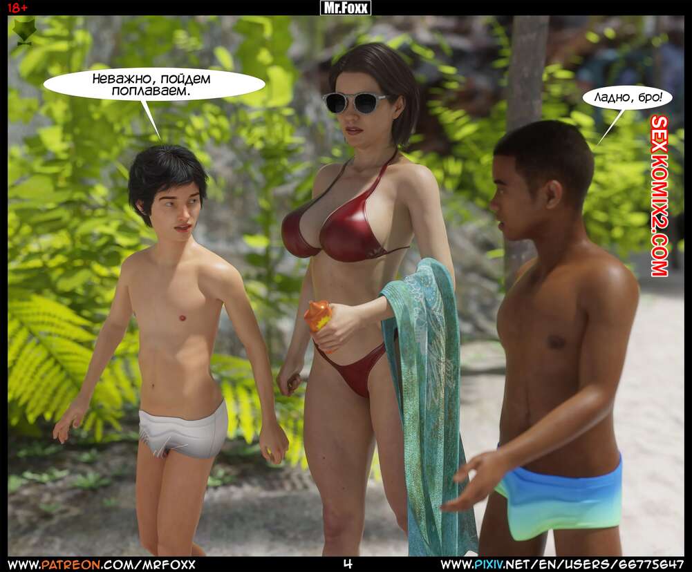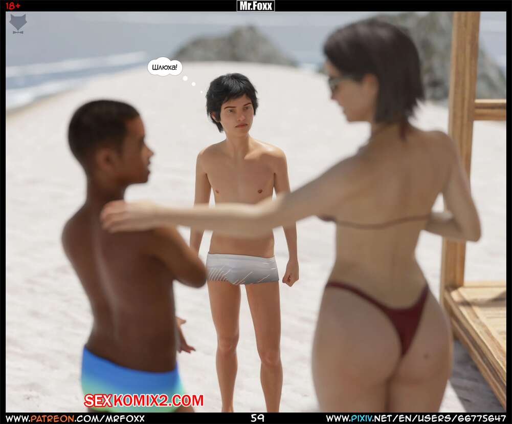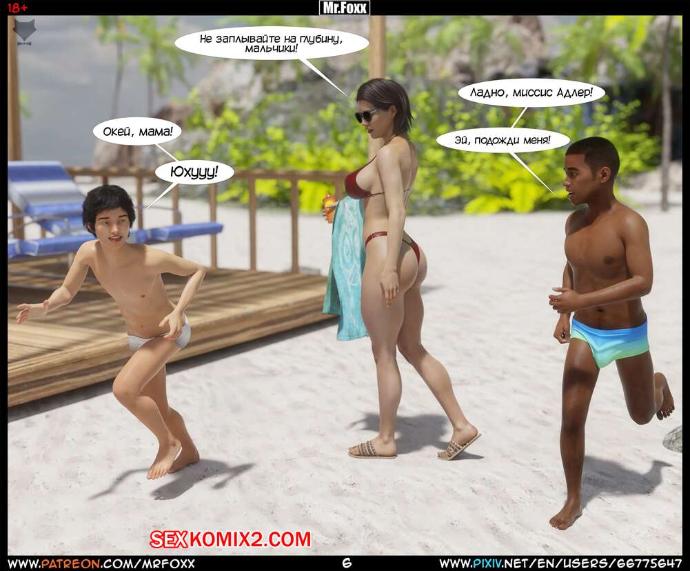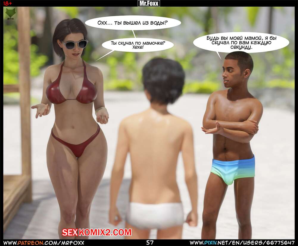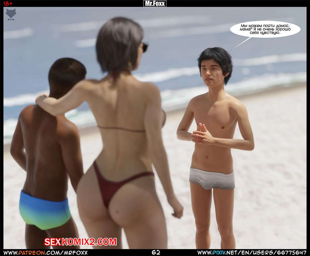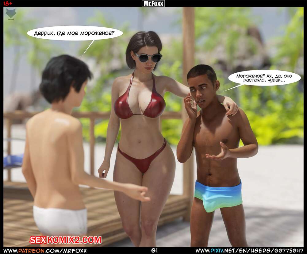 Порно комикс Дело мамы. Часть 1. Moms Affair. Mr.FOXX Сисястая брюнетка милфа отправилась на пляж со своим сыном и его лучшим другом. Темнокожий парень был просто без ума от шикарного тела милфы и предложил ей поебаться с ним.