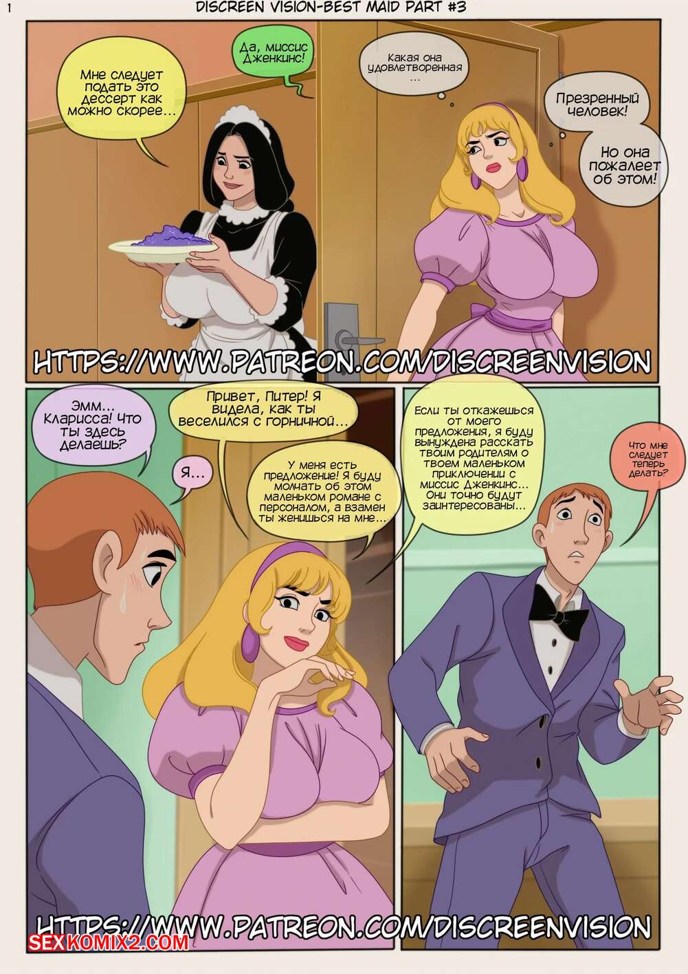 Порно комикс Лучшая горничная. Часть 3. Best maid. Discreen vision. Inusen Блондинка спалила Питера за еблей с горничной и решила с его шантажировать. Питер дал отпор девушке, а когда она осталась одна, красотка стала ласкать свою пизденку, желая получить член парня.