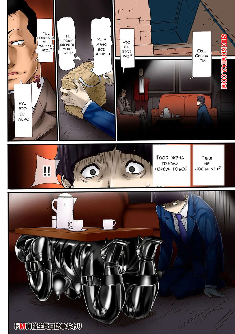 Порно комикс Hitodzuma Chokyo Nisshi. Часть 6. Kuroishi Ringo Сисястая брюнетка милфа встретилась с парнем и надела для него БДСМ костюм. Он дал сучке отсосать свой большой хуй, после чего хорошенько выебал ее пизденку.