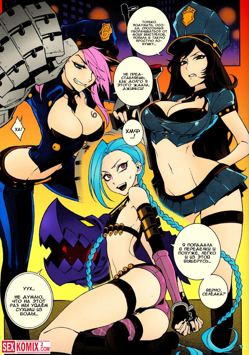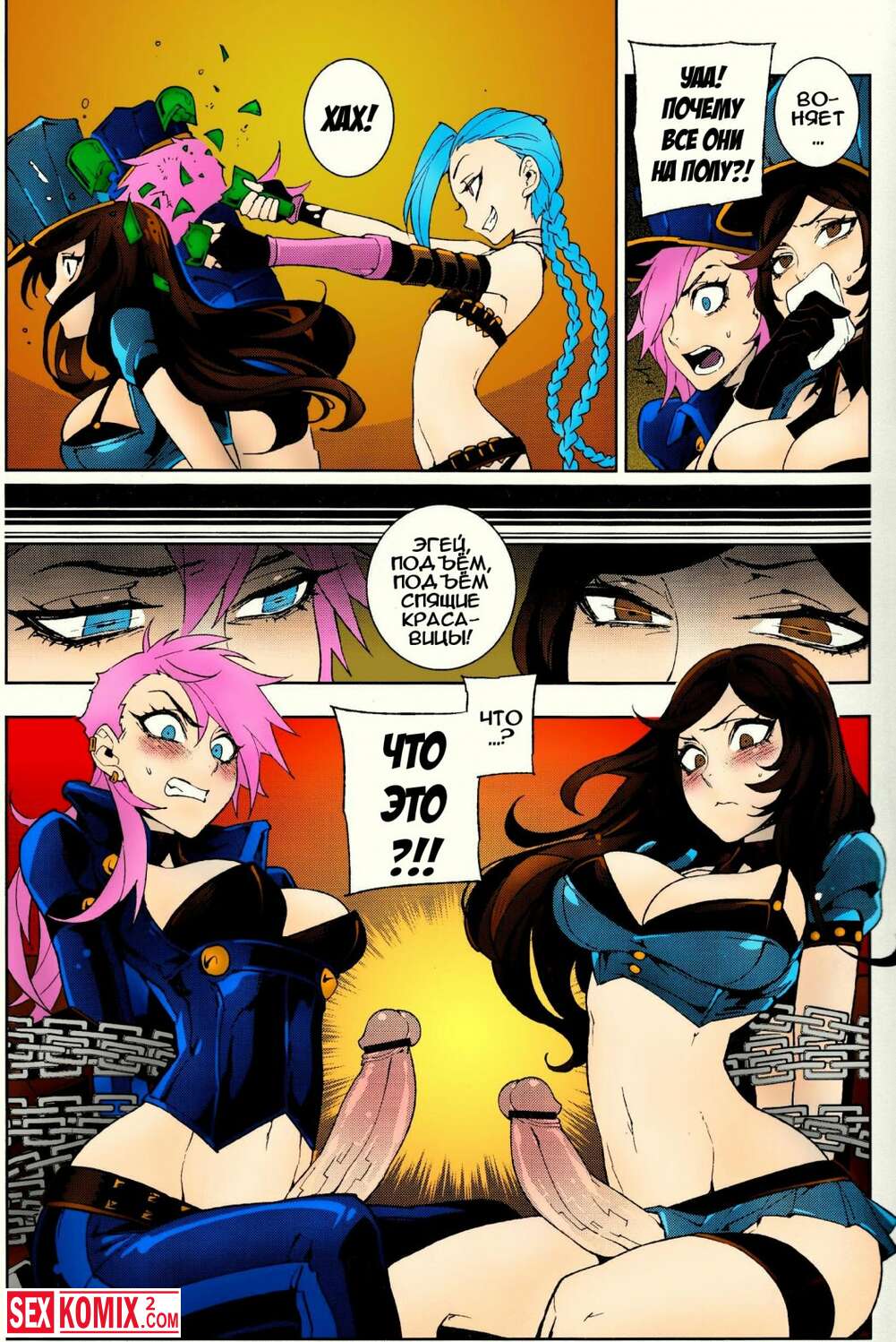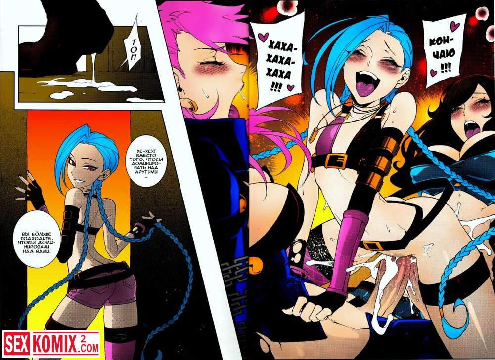 Порно комикс Лига легенд Джинкс. Красотка связала двух трансов, сняла с них штаны. И начала скакать на двух членах сразу.