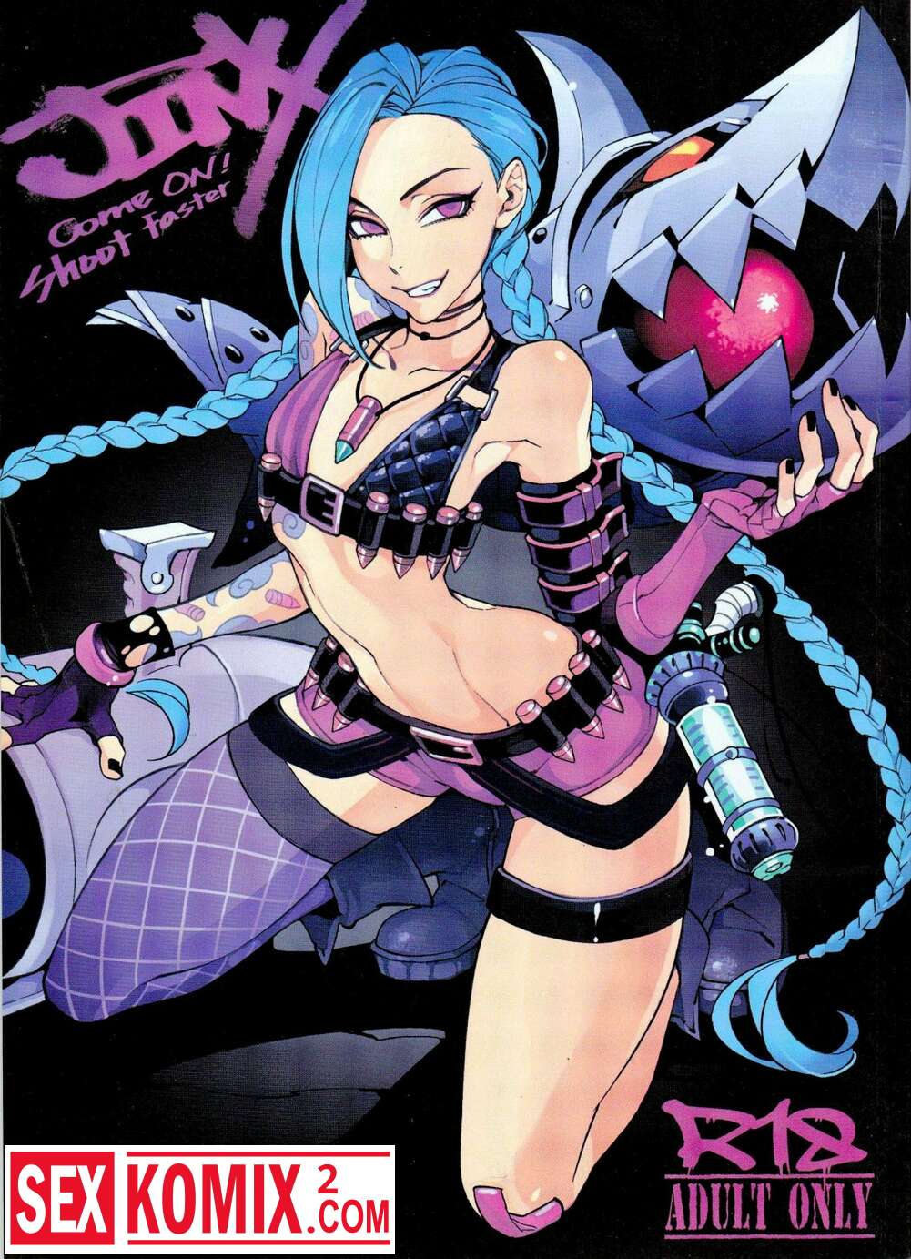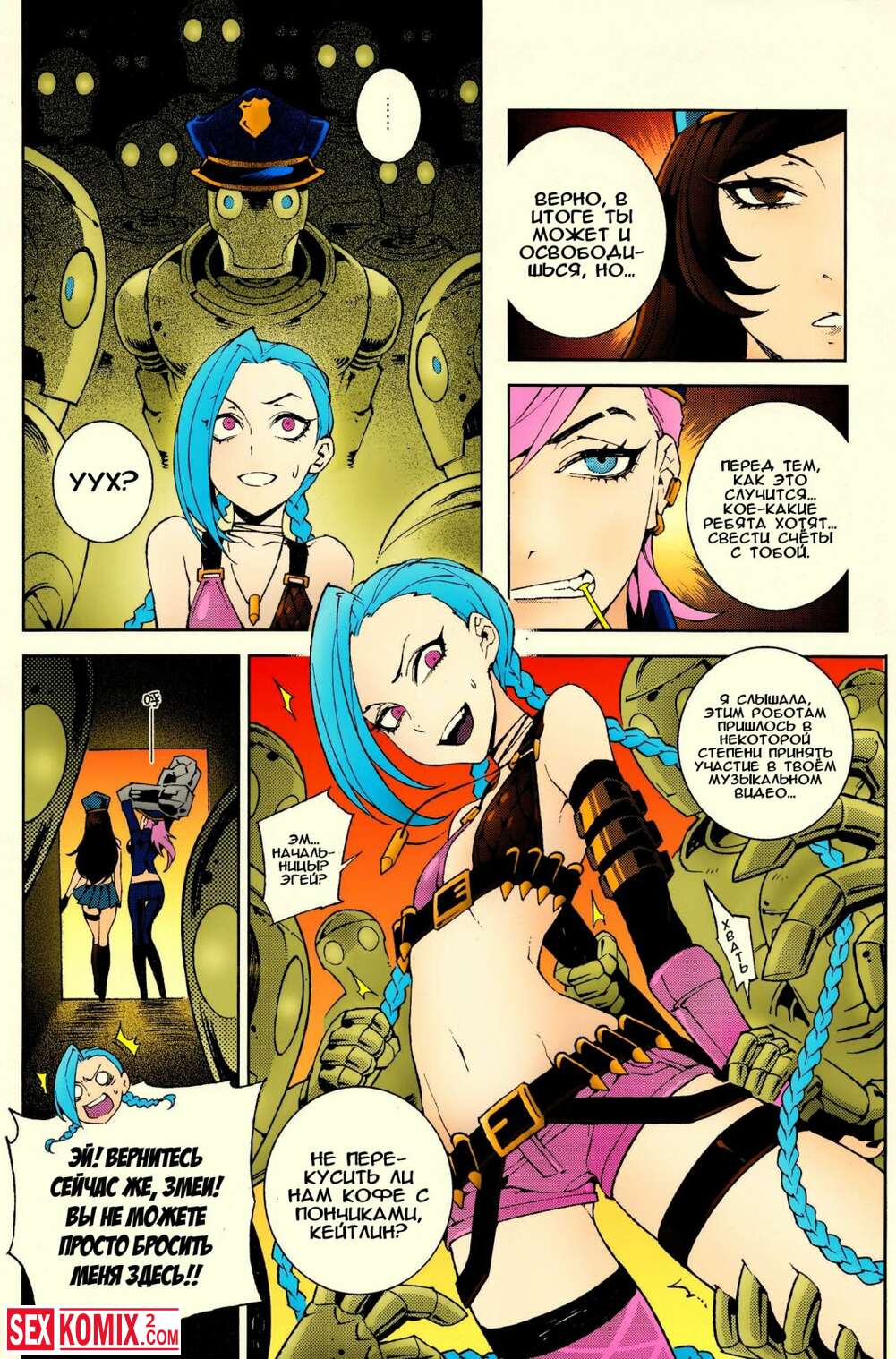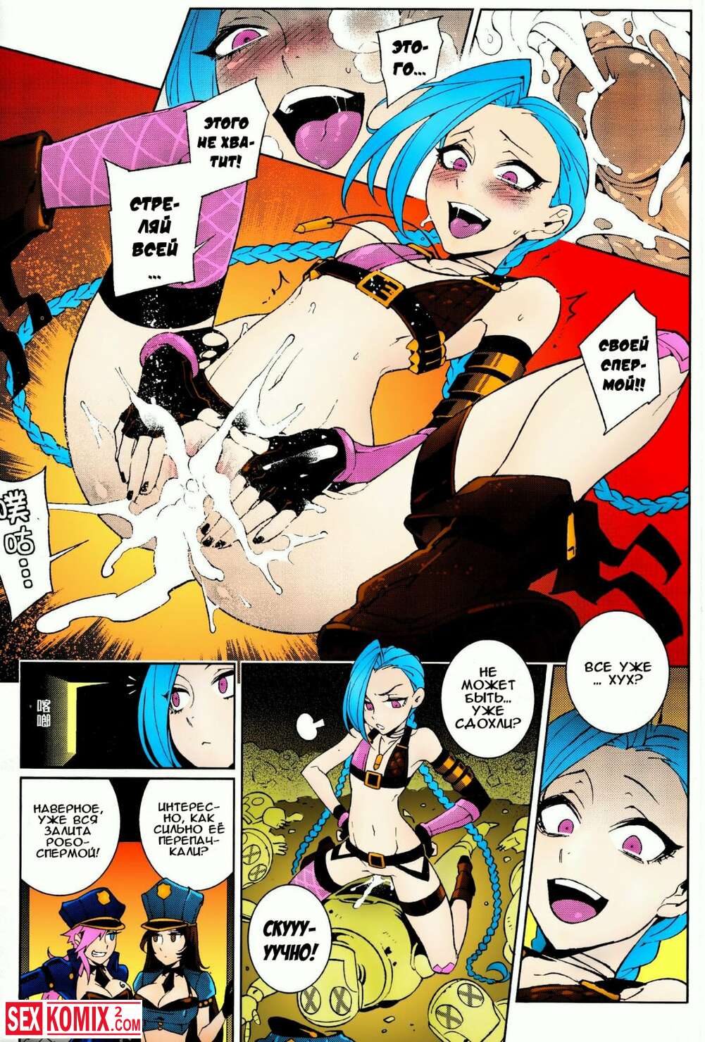 Порно комикс Лига легенд Джинкс. Красотка связала двух трансов, сняла с них штаны. И начала скакать на двух членах сразу.