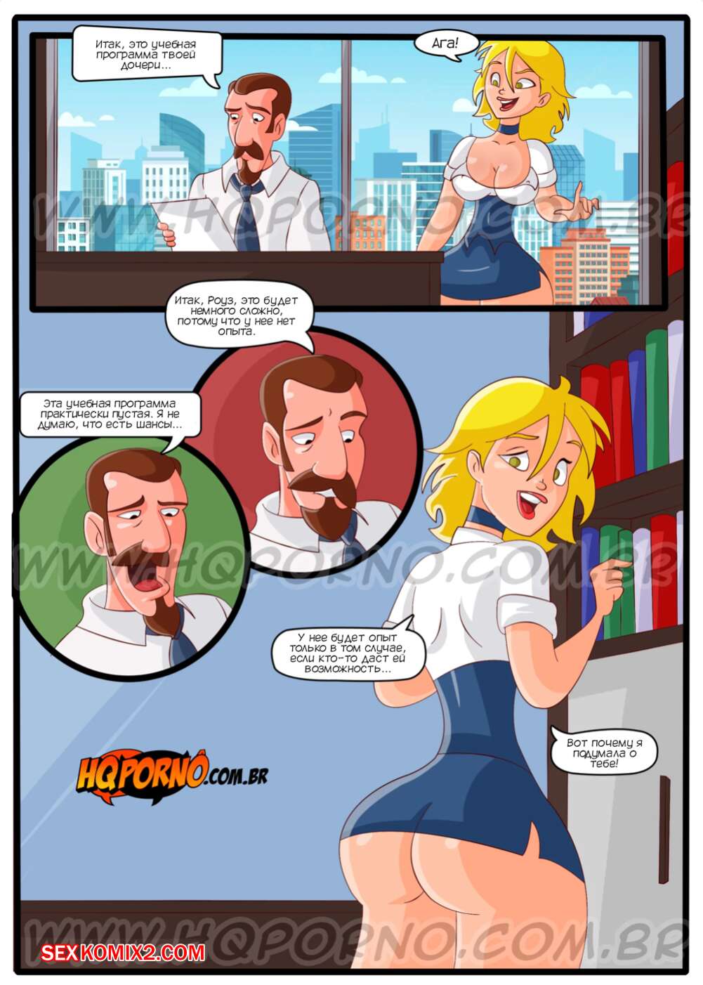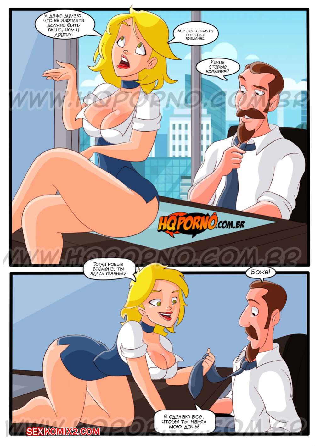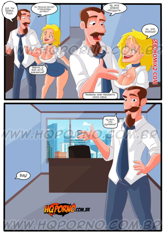 Порно комикс Семейка легкого поведения. Часть 10. Familia do caralho. Hqporno Сексуальная блондинка милфа отправилась в офис к мужу своей подруги, чтобы договориться насчет стажировки ее дочери. Красотка готова на все, поэтому она встала на колени и стала сосать хуй мужчины.