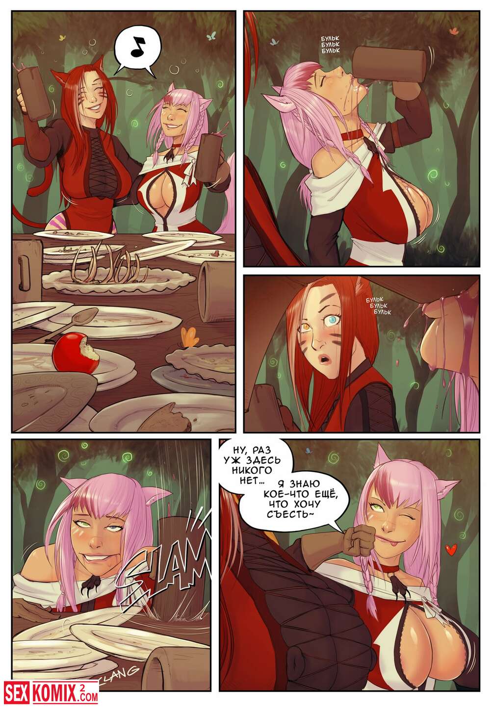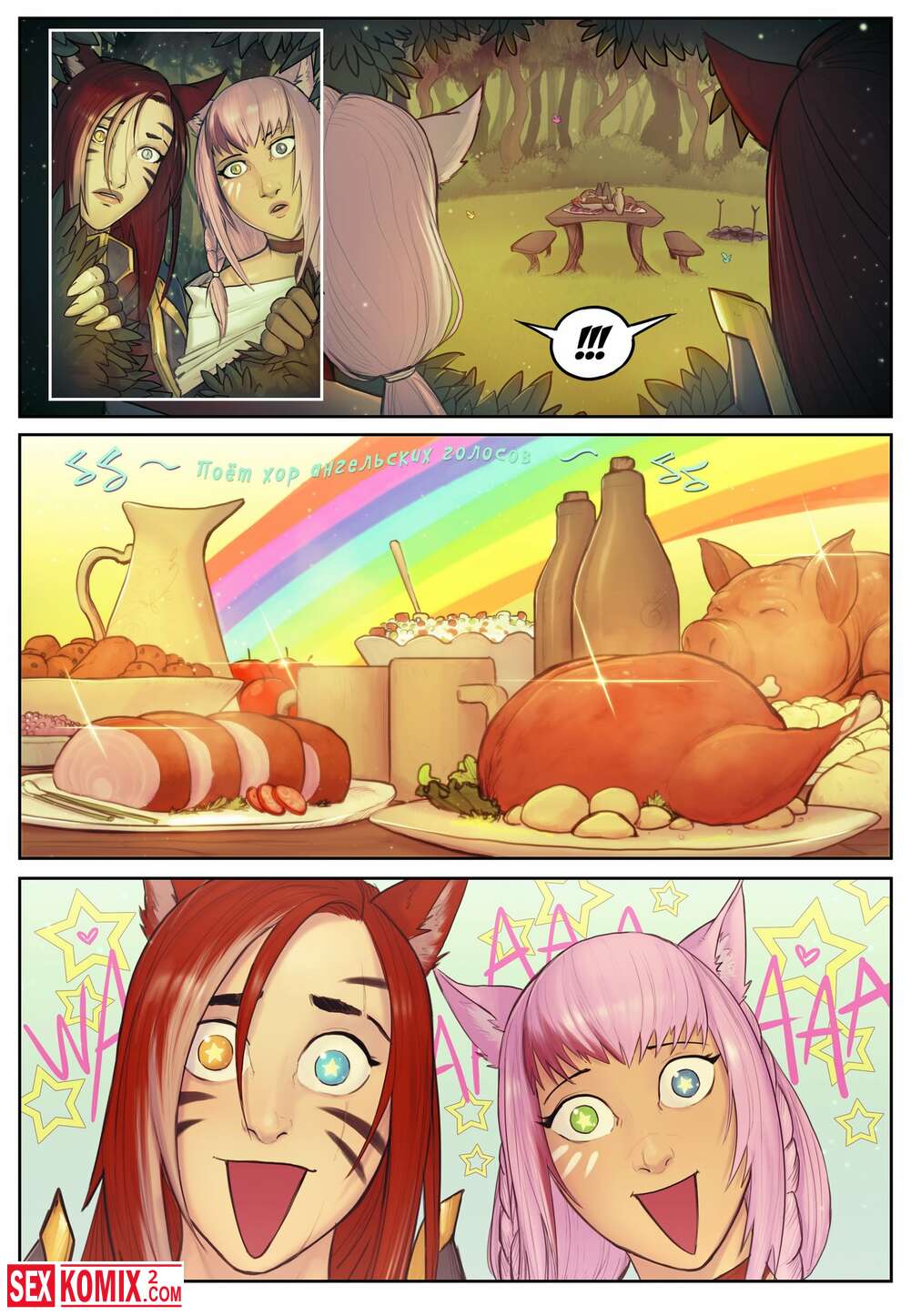 Порно комикс Цена еды. Две красотки в лесной чаще нашли поляну засыпанную едой, они были очень голодны и не смогли отказаться от все этого, но потом пришли последствия.