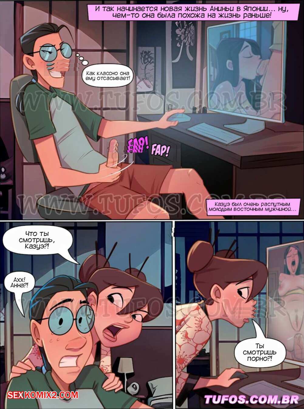 Порно комикс Четверо похотливых. Часть 7. As 4 sacanas. Tufos Анинья приехала в свой новый дом в Японии. Красотка переоделась в кимоно и застала молодого парня за просмотром порно, что ее очень возбудило. Девушка разделась и отсосала хуй парня, после чего дала ему себя выебать и кончить в нее.
