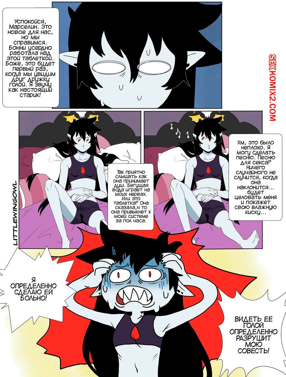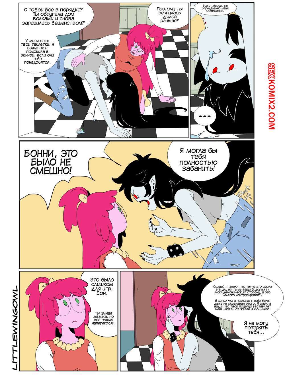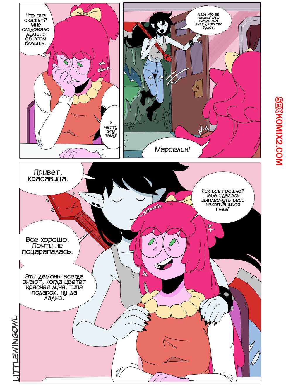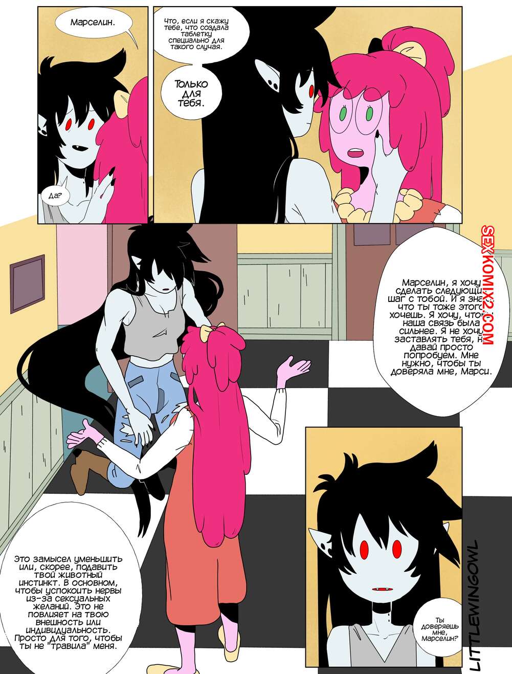 Порно комикс Adventure Time. Пузырь. Часть 1. Bubbline comic. LittleWingOwl. Марселин вернулась домой после после тяжелой недели и Бонни сообщила подруге, что хочет заняться с ней сексом. Марси долго отказывалась, боясь причинить подруге боль, но все таки они разделись и приступили к лесбийским играм.