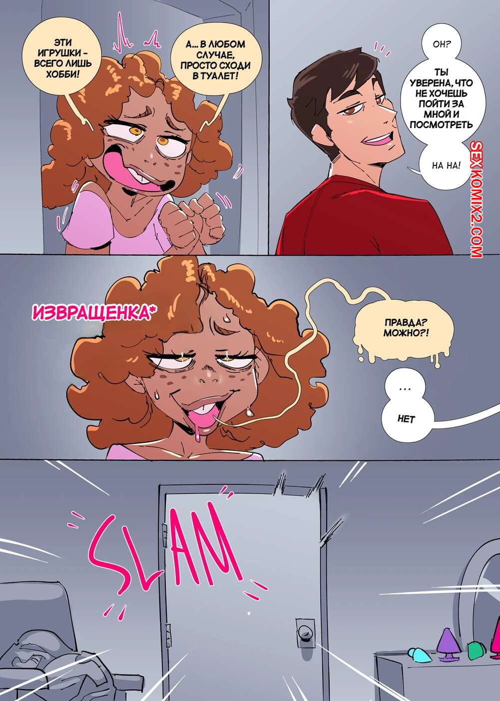 Порно комикс Извращена. Часть 3. Perverted. DSAN. Горячая сексуальная брюнетка была очень возбуждена и хотела трахаться. Она разделась и отсосала большие хуи парней, после чего дала им себя хорошенько выебать.