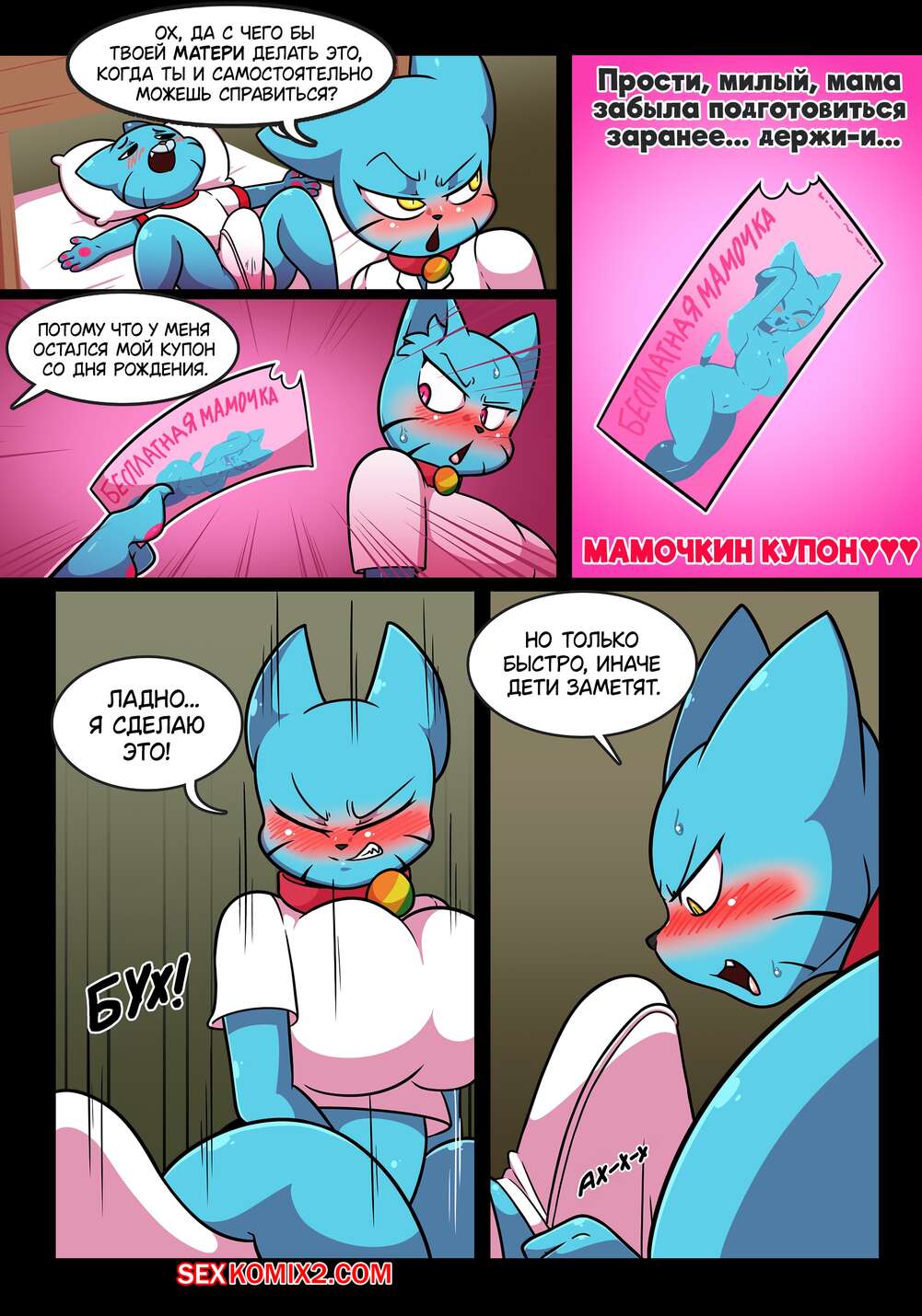 Порно комикс Похотливый мир Николь. Часть 1. Понедельник. The Amazing World Of Gumball. Wherewolf Горячая милфа пошла будить своего сына и обнаружила у парня стояк. Это очень возбудило мамочку, поэтому она встала на колени и стала сосать большой хуй сына.