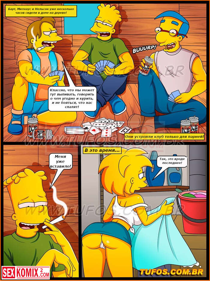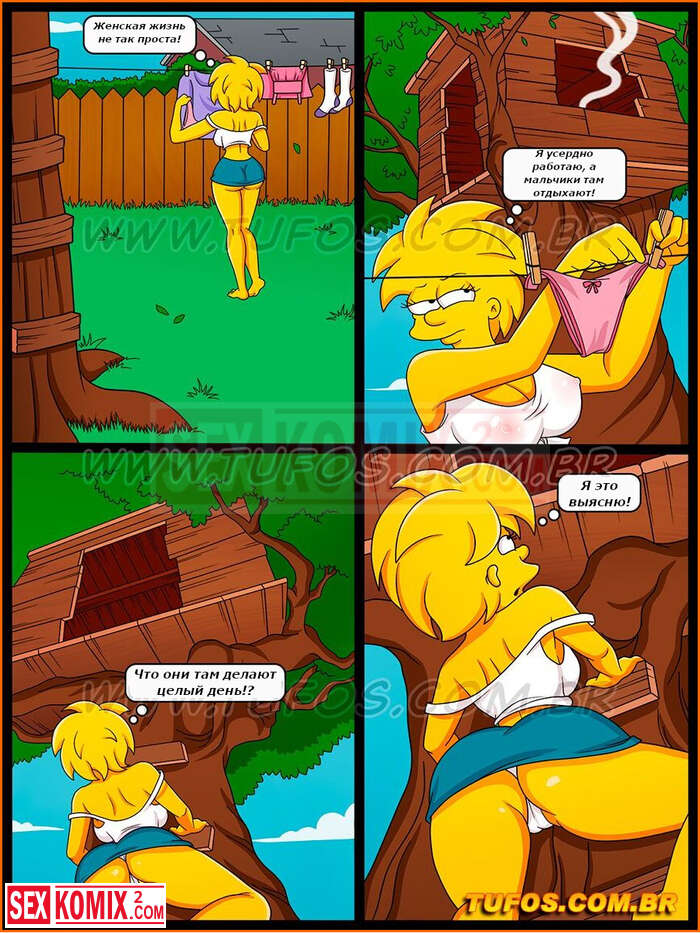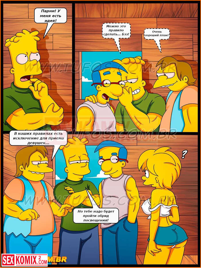 Порно комикс Симпсоны. Часть 24. Мужской клуб. Лиза услышала мужские голоса в домике на дереве и полезло посмотреть кто-там. Это был Барт со своими друзьями. Они пригласили девушку поиграть с ними.