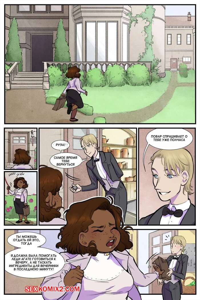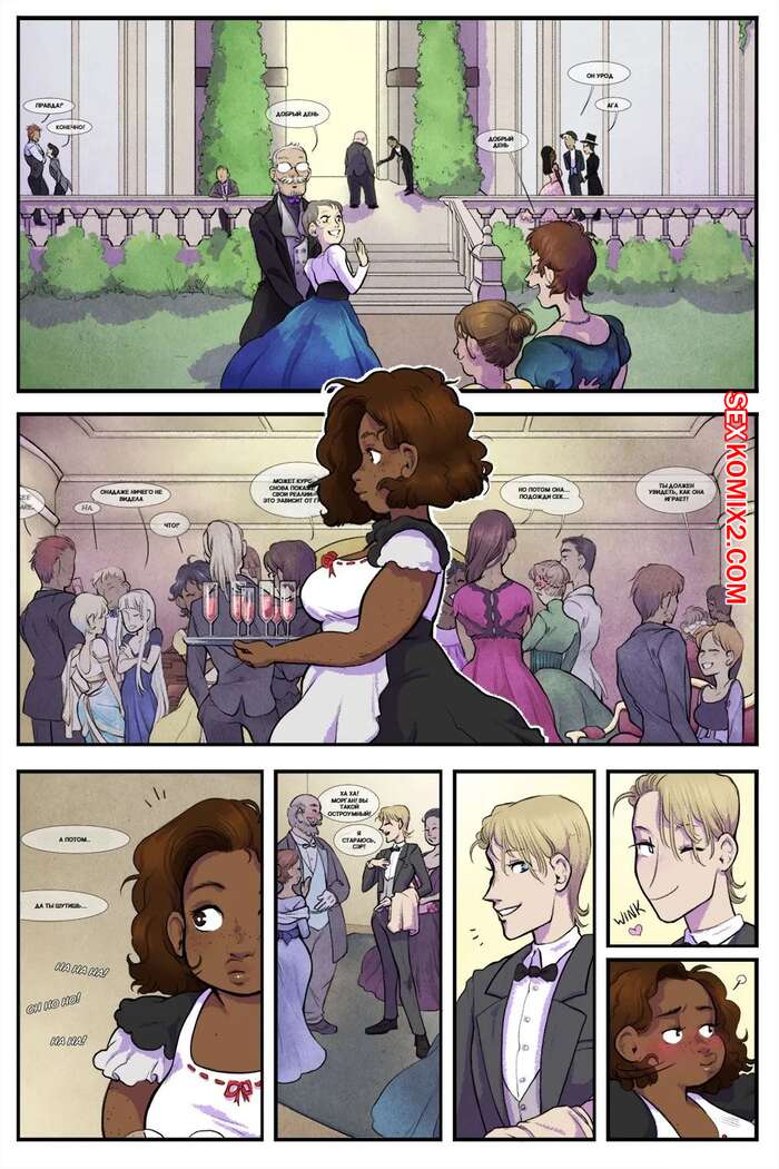 Порно комикс Нарушение этикета. Breaking Etiquette. Dsan Во время бала парень решил повеселиться с горячей темнокожей брюнеткой горничной. Он отвел ее в уединенное место, где снял с девушки трусики и отлизал ее пизденку.