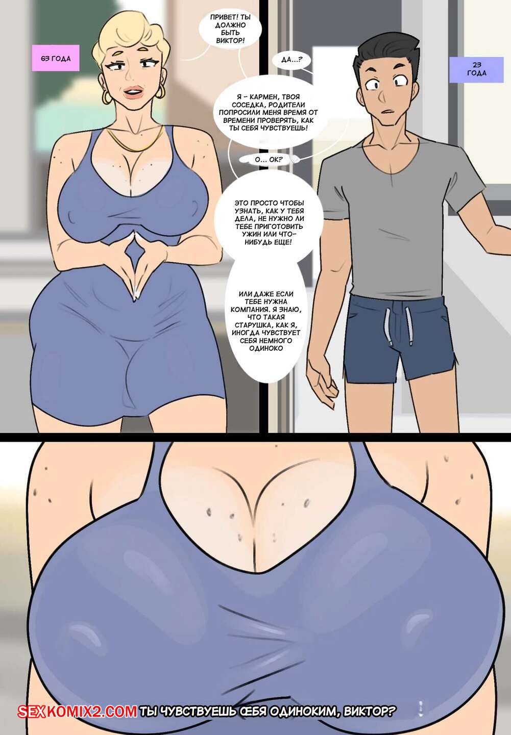 Порно комикс Бабуля по соседству. GILF next door. Jopuari Сисястая блондинка милфа отрпавилась к своему молодому соседу, желая с ним повеселиться. Красотка разделась и возбудила парня шикарным телом, после чего стала дрочить его хуй своими ножками.