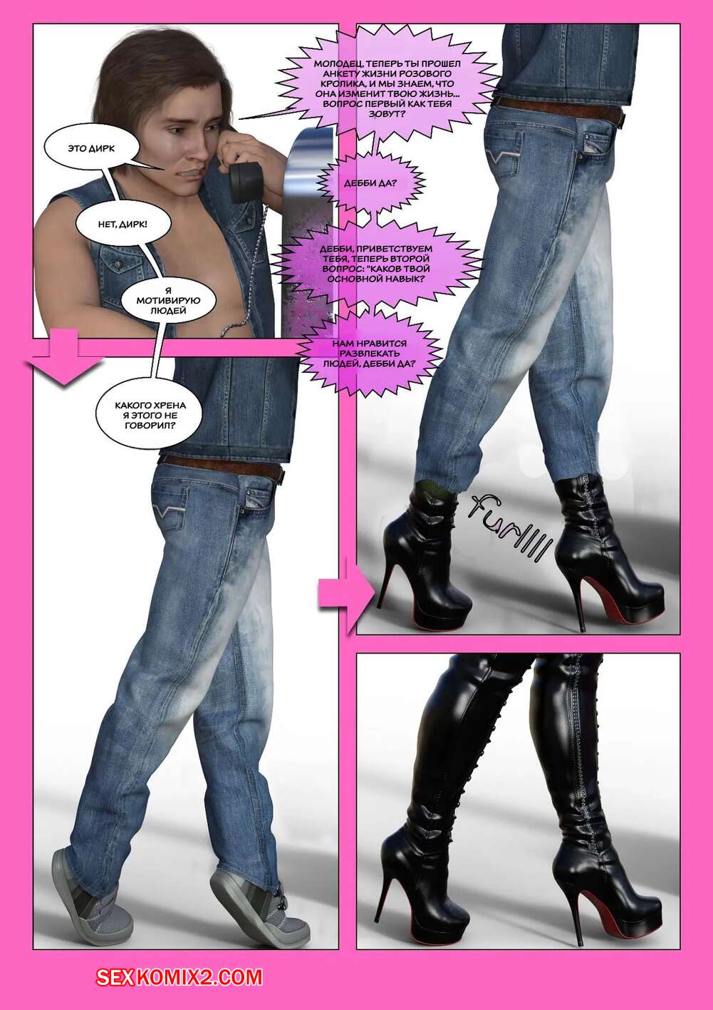 Порно комикс Розовый кролик. Часть 5 и 6. Pink Bunny. Keshara Молодые парни пользуются необычным приложением. Нажав на кнопку, они превращаются в горячих сексуальных красоток, которые привлекают внимание ровесников, желающих выебать девушек.