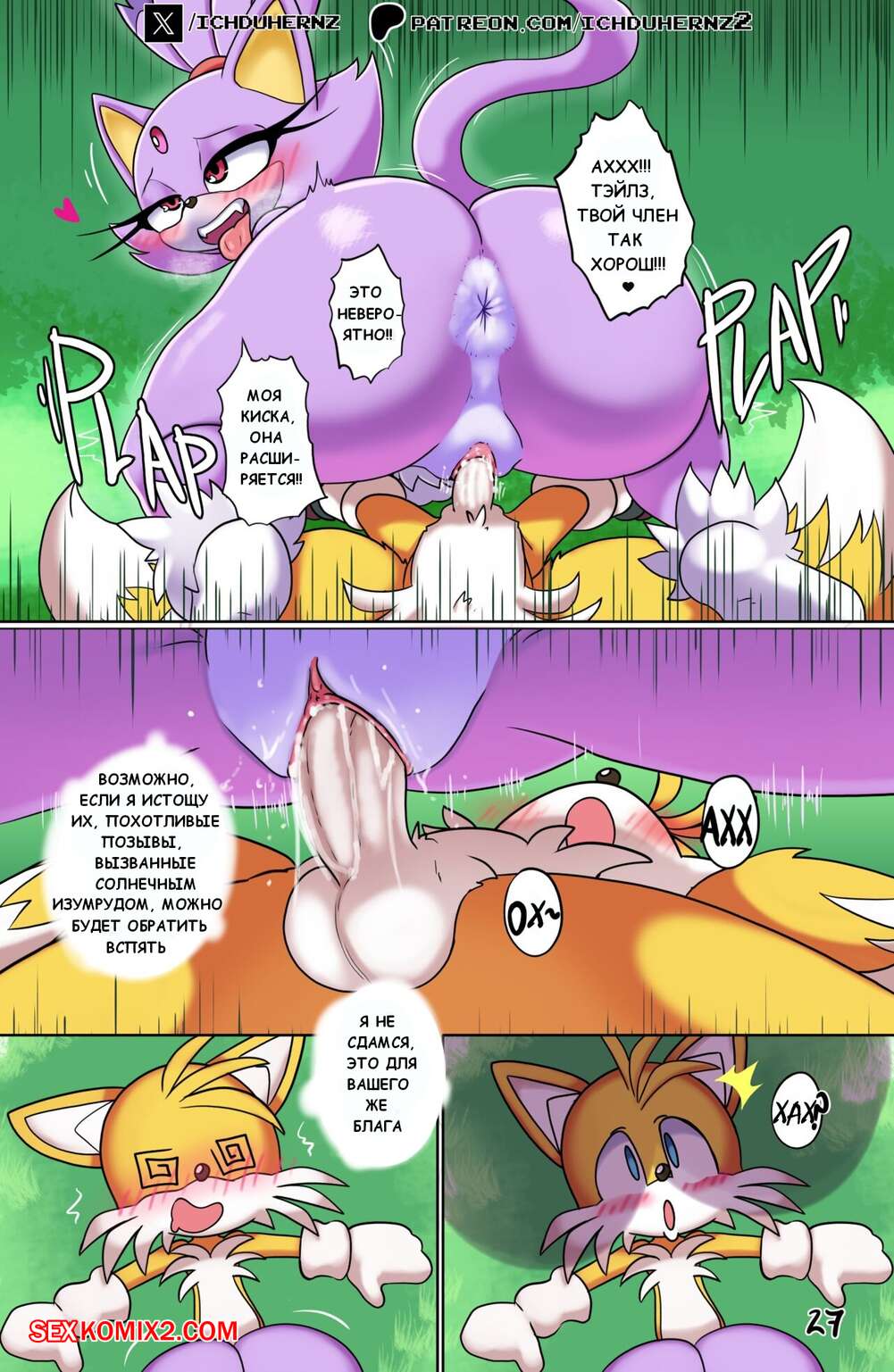 Порно комикс Соник. Спешка Тейлза. Tails Rushd. Blazy Mix. Ichduhernz Две горячие сисястые девушки подверглись действию кристала, от чего их тела изменялись, а девушки возбудились. Они разделись и стали ласкать друг дружку, пока Тейлз за ними наблюдал.