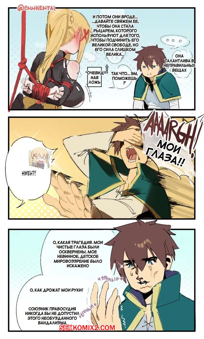 Порно комикс Коносуба. Konosuba. Ennhentai Парень схватил и связал сексуальную блондинку, желая ее наказать. Он раздел девушку и дал ей отсосать свой большой хуй, после чего выебал пизденку девушки и кончил в нее.