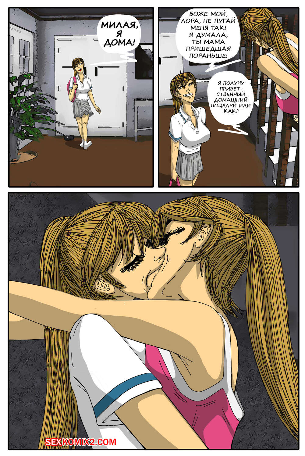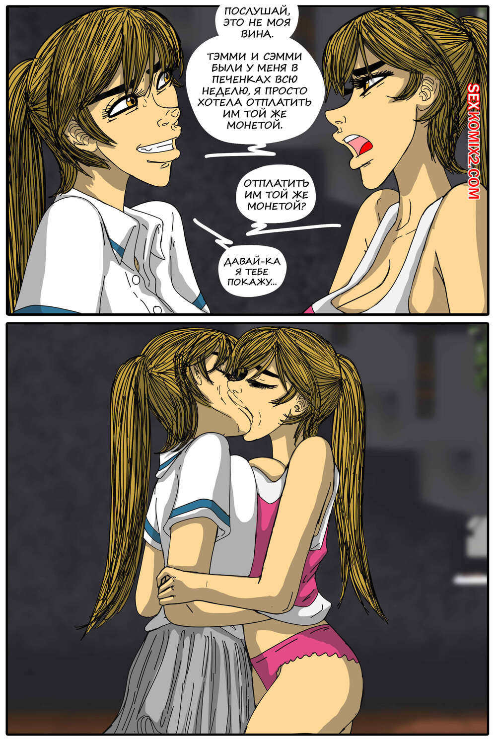 Порно комикс Инцестные делишки. Часть 8 Горячие сестренки очень возбуждены и хотят трахаться. Девушки раздеваются и ласкают друг дружку, после чего занимаются страстной лесбийской еблей, получая огромное удовольствие.