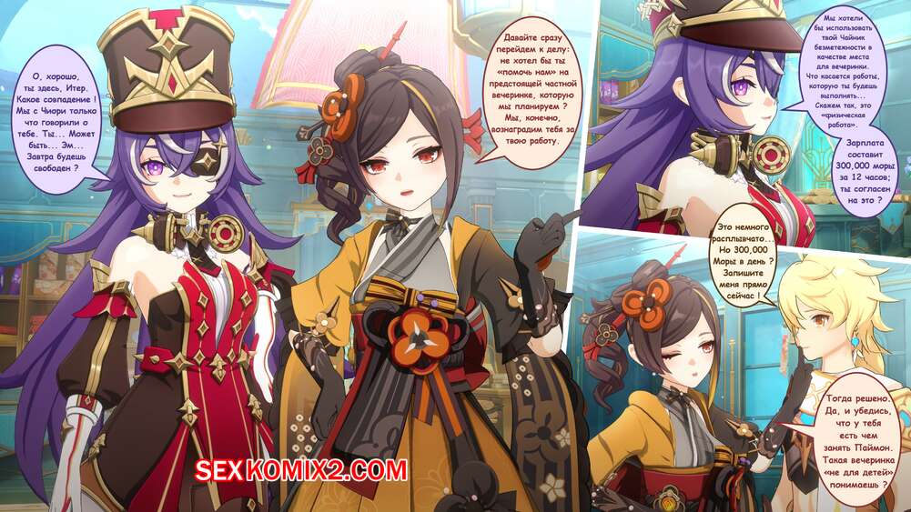 Порно комикс Genshin Impact. Частная вечеринка в Фонтейне. PastaPaprika Горячие красотки были очень возбуждены и решили повеселиться со своим дружком. Девушки разделись и отсосали большой хуй парня, после чего дали ему себя хорошенько выебать.