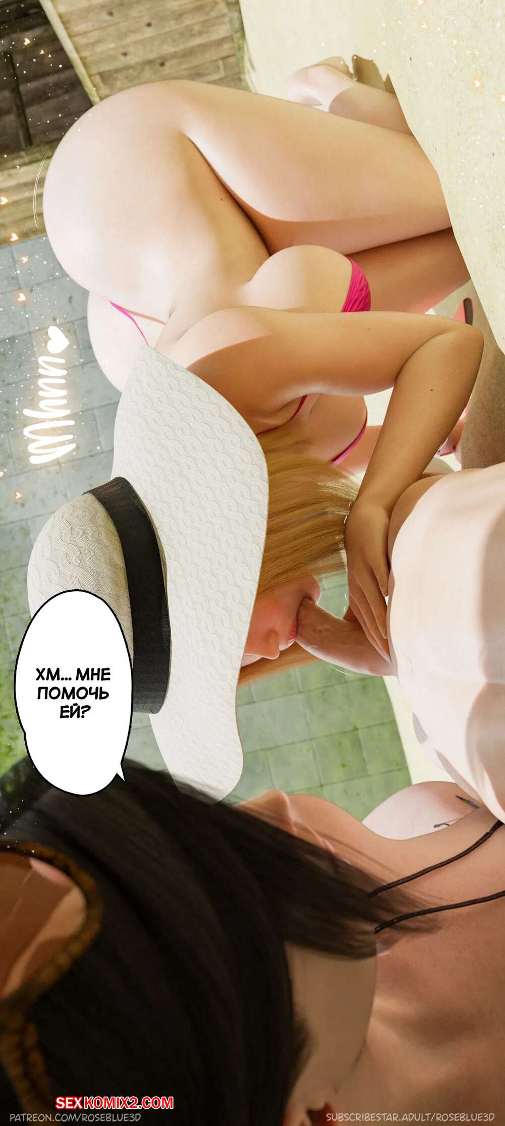 Порно комикс Моя соседская вдова. Часть 20. My Neighbors Widow. Rose Blue 3D Горячие красотки были очень возбуждены и решили повеселиться со своим дружком. Девушки разделись и стали сосать большой хуй парня, после чего дали ему выебать свои пизденки.