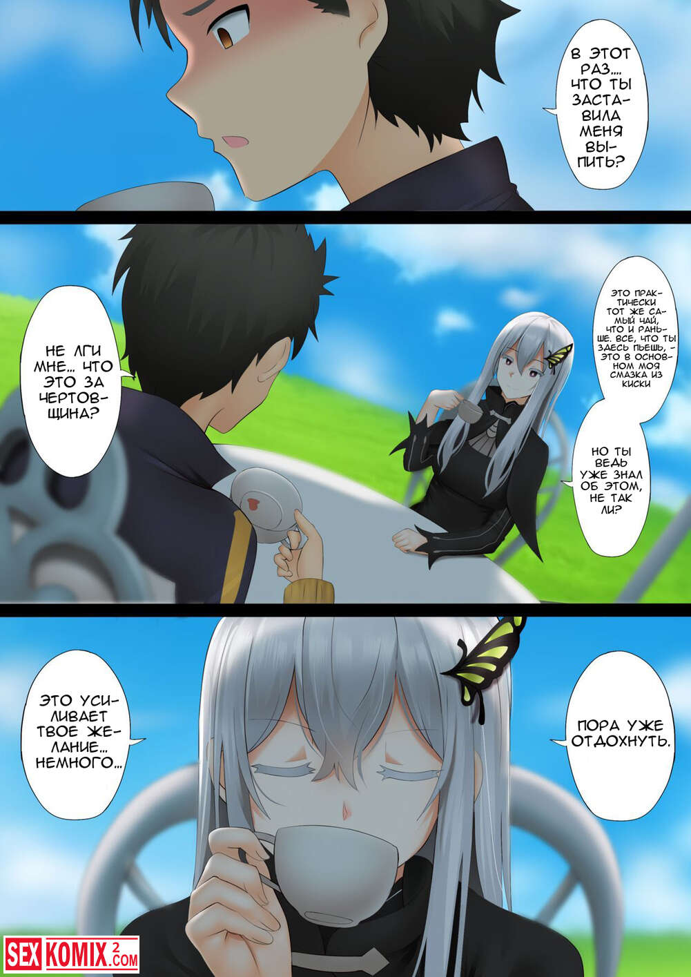 Порно комикс Ехидна. Zero. Красивая блондинка пришла на чаепитие со парнем и намеревалась соблазнить его. Она хорошо подготовилась, выбрила свою киску и когда сняла трусики он не смог устоять перед ней.
