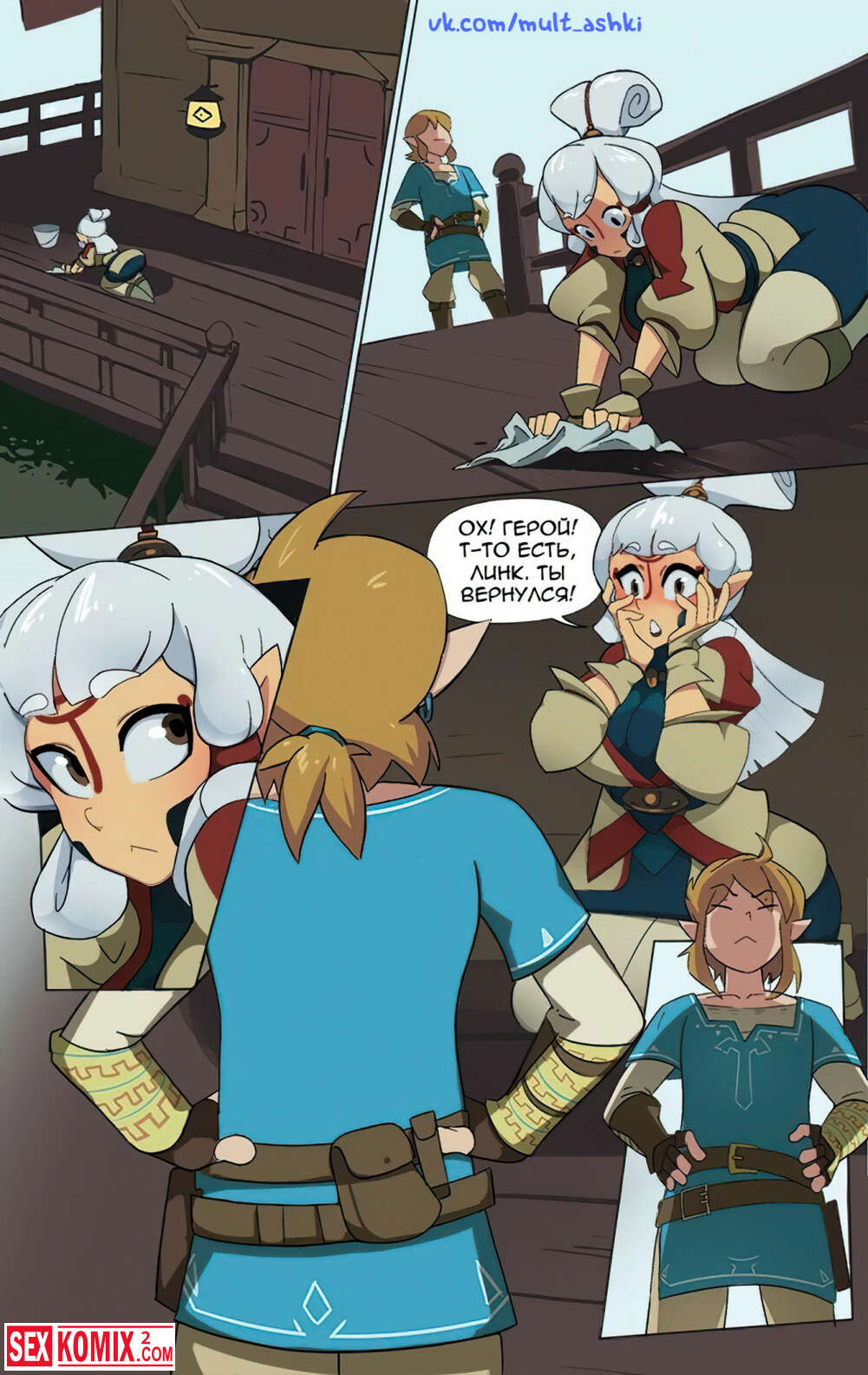 Порно комикс Ночной посетитель. Линк вернулся после долгого путешествия, его девушка приготовила ему подарок. Она разделась и попросила трахнуть её, парень сразу возбудился, когда увидел её большие сиськи.