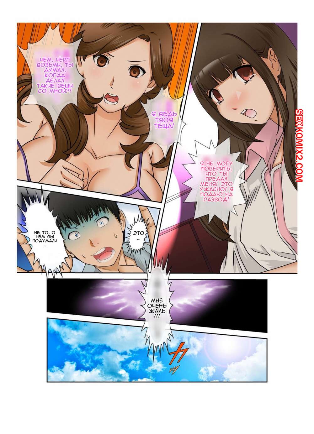 Порно комикс В один прекрасный день моя жена и тёща поменялись телами. Часть 1 и 2. fuuga Горячая милфа и ее дочь поменялись телами, что очень обрадовало их мужей. Они с удовольствием раздевают красоток и трахают их пизденки, получая огромное удовольствие.