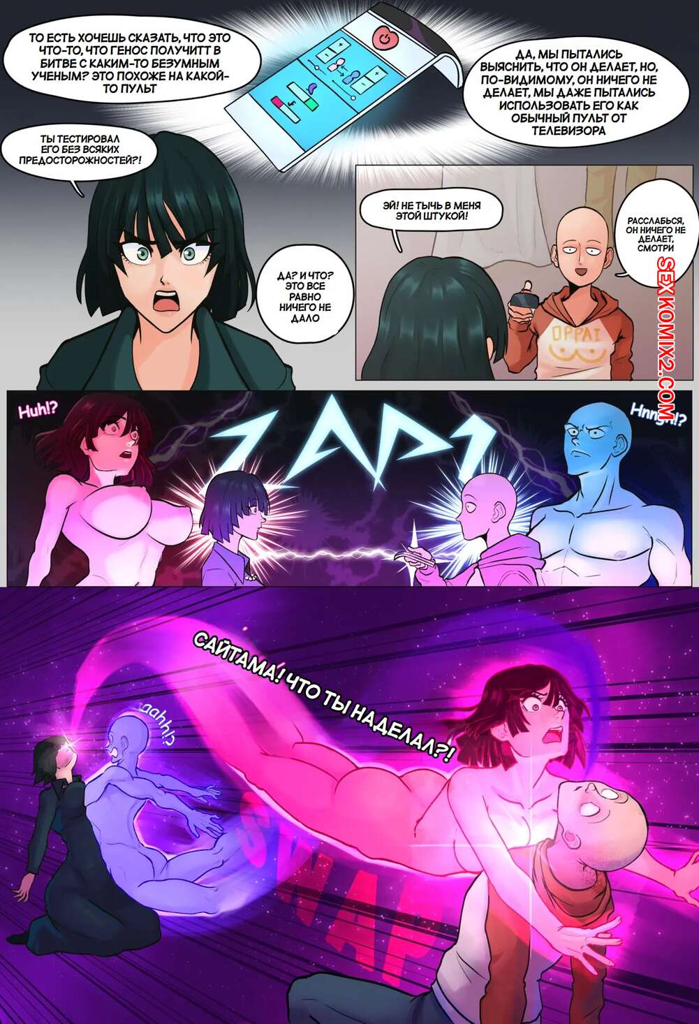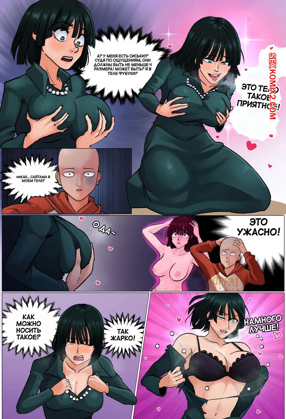 Порно комикс One Punch Man. Фаузи. Фубуки и Сайтама поменялись телами. TSFSingularity Фубуки и Сайтама поменялись телами и парень решил воспользоваться такой шикарной возможностью. Девушка стала трогать свои большие сиськи, после чего сняла трусики и стала ласкать свою пизденку.