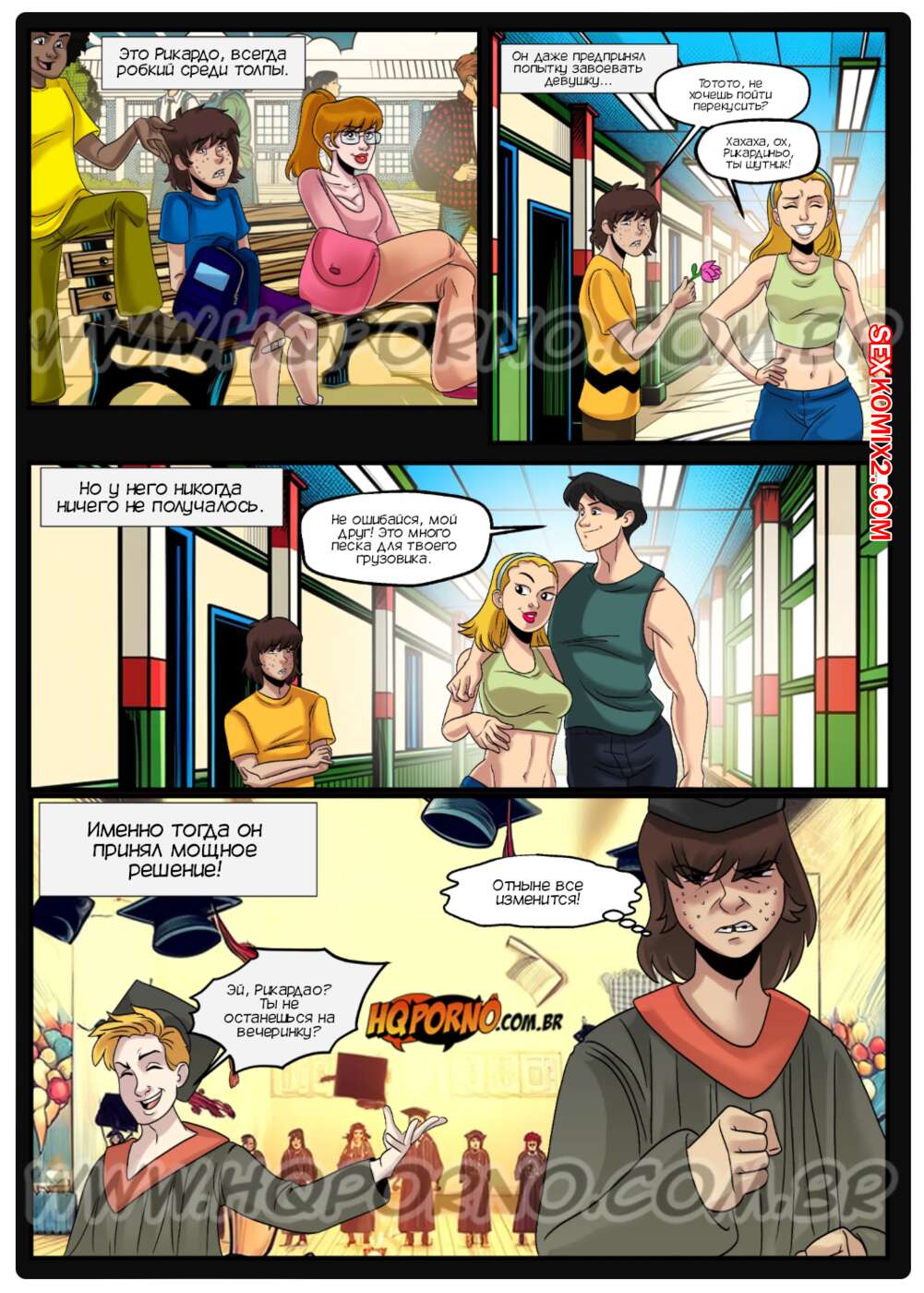 Порно комикс Рикардао Таларико. Часть 1. Воссоединение старой банды. HQPorno Рикардао был неудачником в школе и решил это исправить. Он занялся собой и достиг отличных результатов. На встрече выпускников парень привлек внимание девушки, в которую был влюблен в школе, но она выбрала другого парня. Пока муж красотки спал, Рикардао соблазнил блондиночку своим большим хуем и выебал ее во все дырочки.