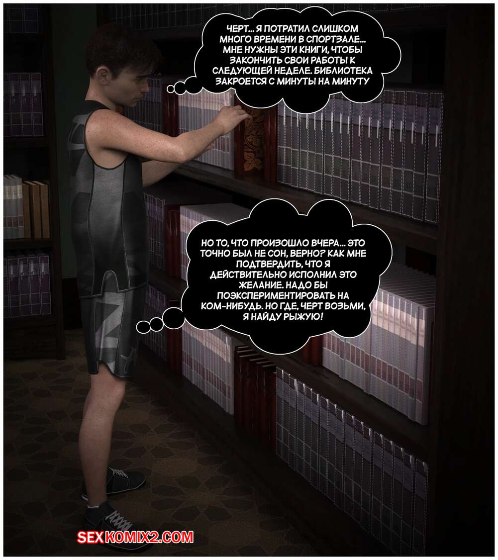 Порно комикс Желание. Часть 2. The wish. Manual focus Молодой парень пришел в библоитеку к горячей рыжей милфе и загадал желание. Красотка разделась и стала сосать большой хуй парня, после чего дала ему себя выебать.