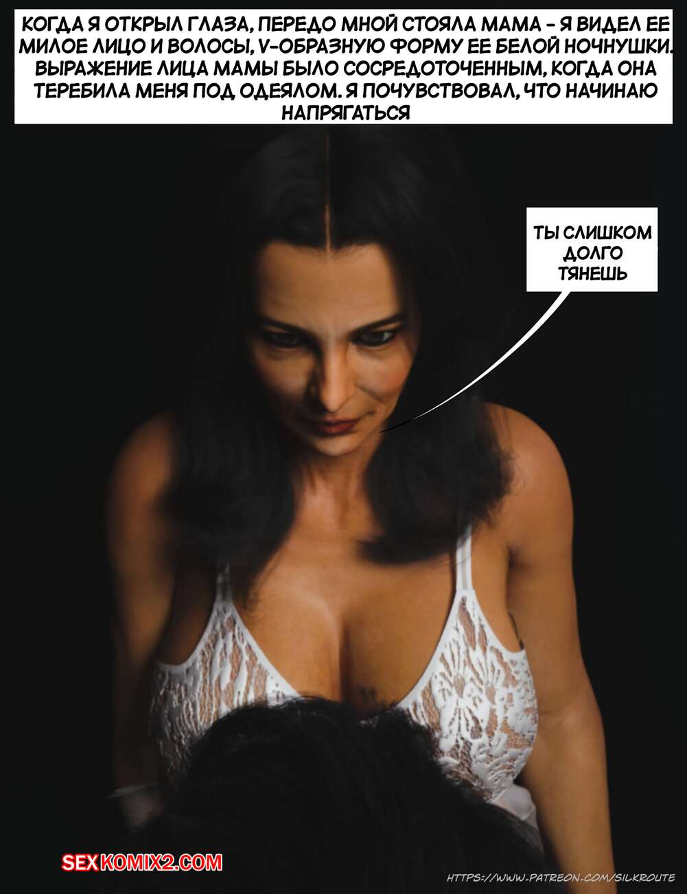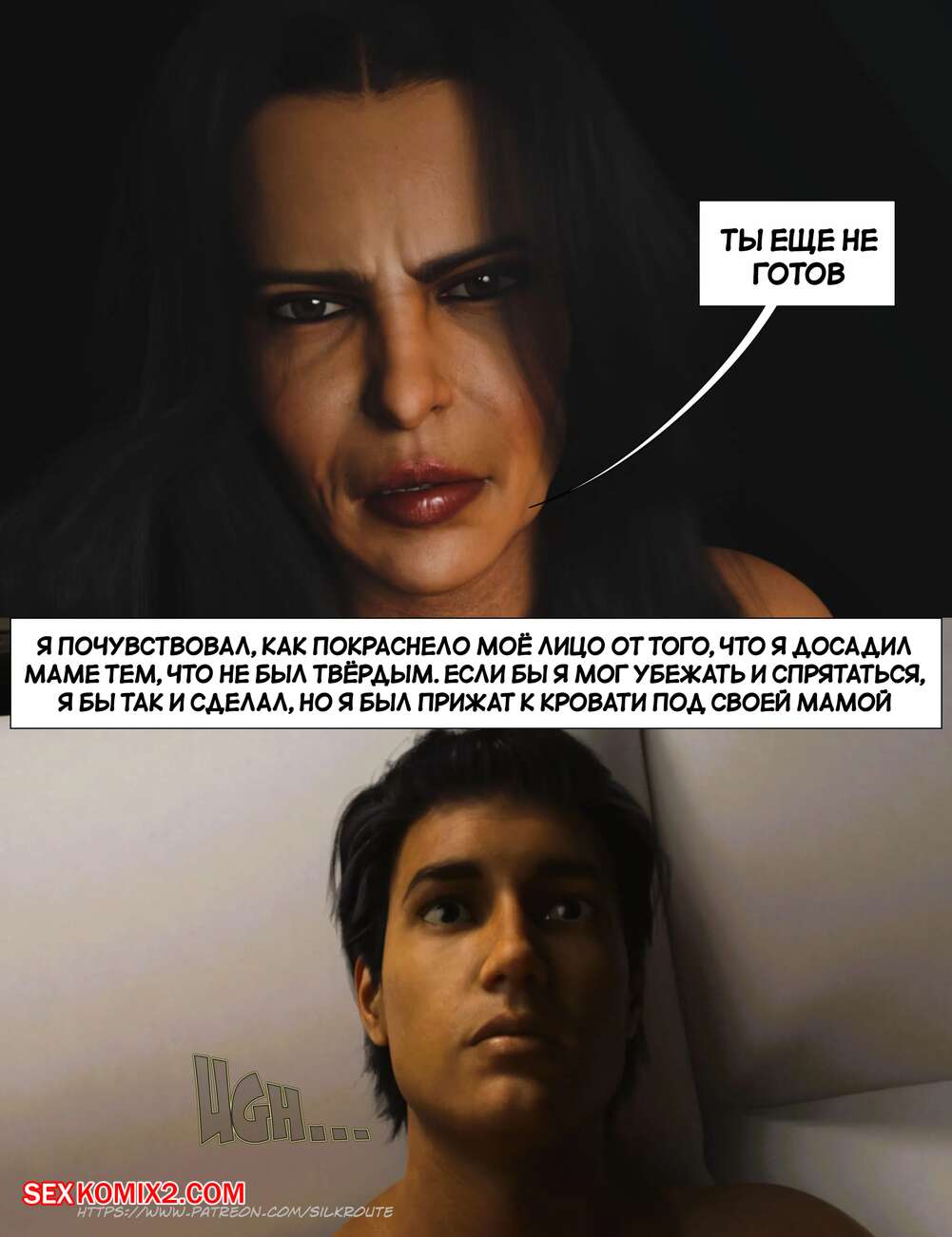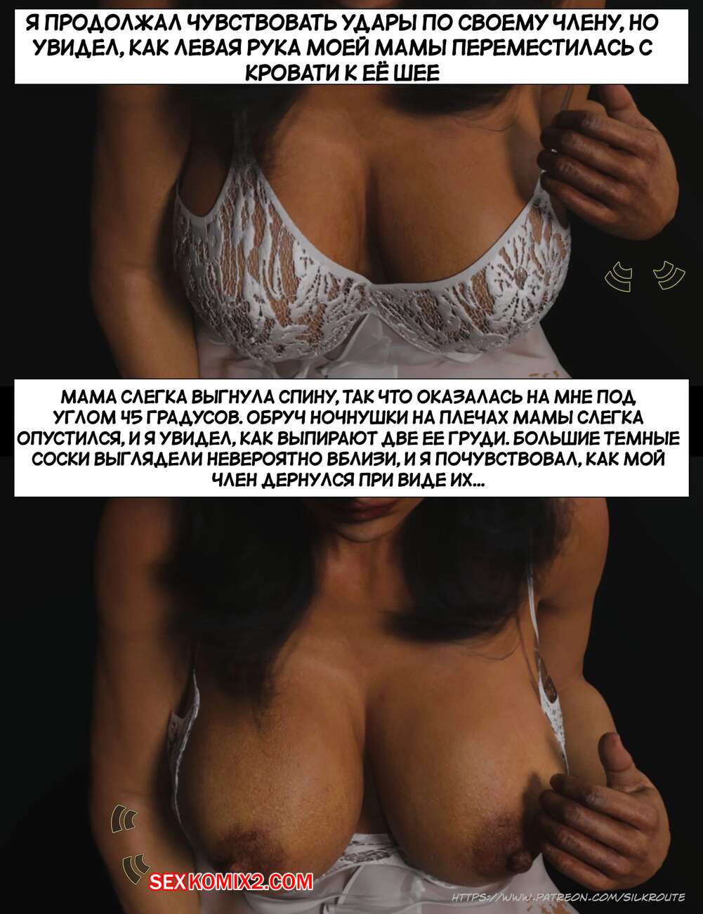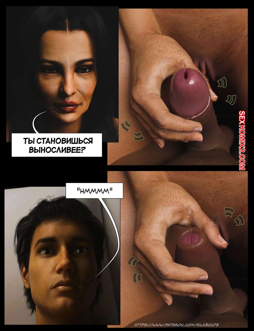 Порно комикс Прошу, помоги мне расслабиться. Часть 7. Please Relieve Me. Silk Route, Ira Raman Горячая милфа продолжает помогать своему сыну снимать напряжение. Красотка разделась и возбудила парня шикарным телом, после чего стала сосать и дрочить его член.