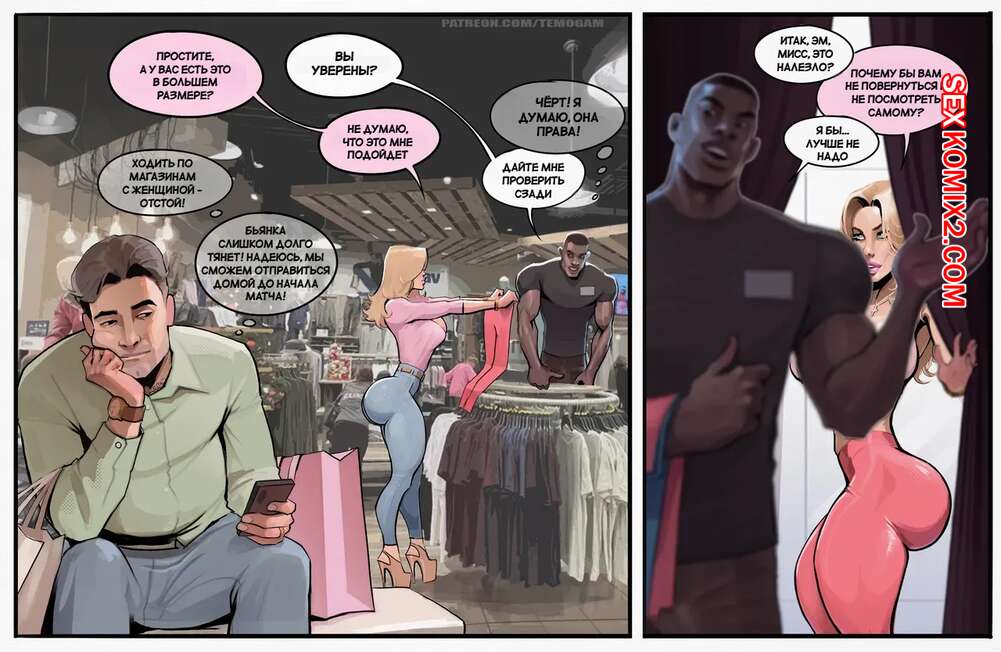 Порно комикс Идеальная посадка. The Perfect Fit. Temogam Горячая милфа блондинка пришла со своим мужем в магазин одежды, чтобы прикупить себе новые наряды. Там красотка соблазнила темнокожего парня и отсосала его член, после чего дала ему выебать свою пизденку.