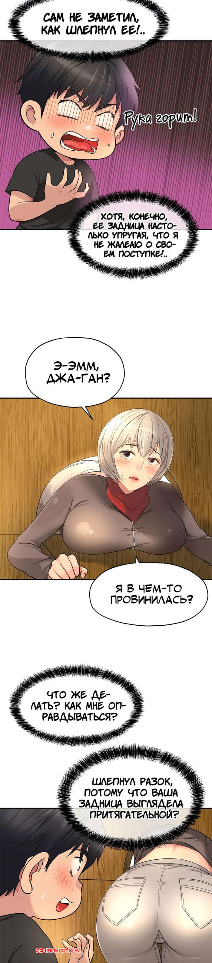 Порно комикс Маленький магазинчик. Дыра снова открыта. Часть 16 и 17 и 18 Горячая блондинка застраяла и не может пошевелиться. Парнишка не может упустить момент, поэтому он стянул трусики с девушки и стал ласкать ее пизденку, желая поскорее ее трахнуть.