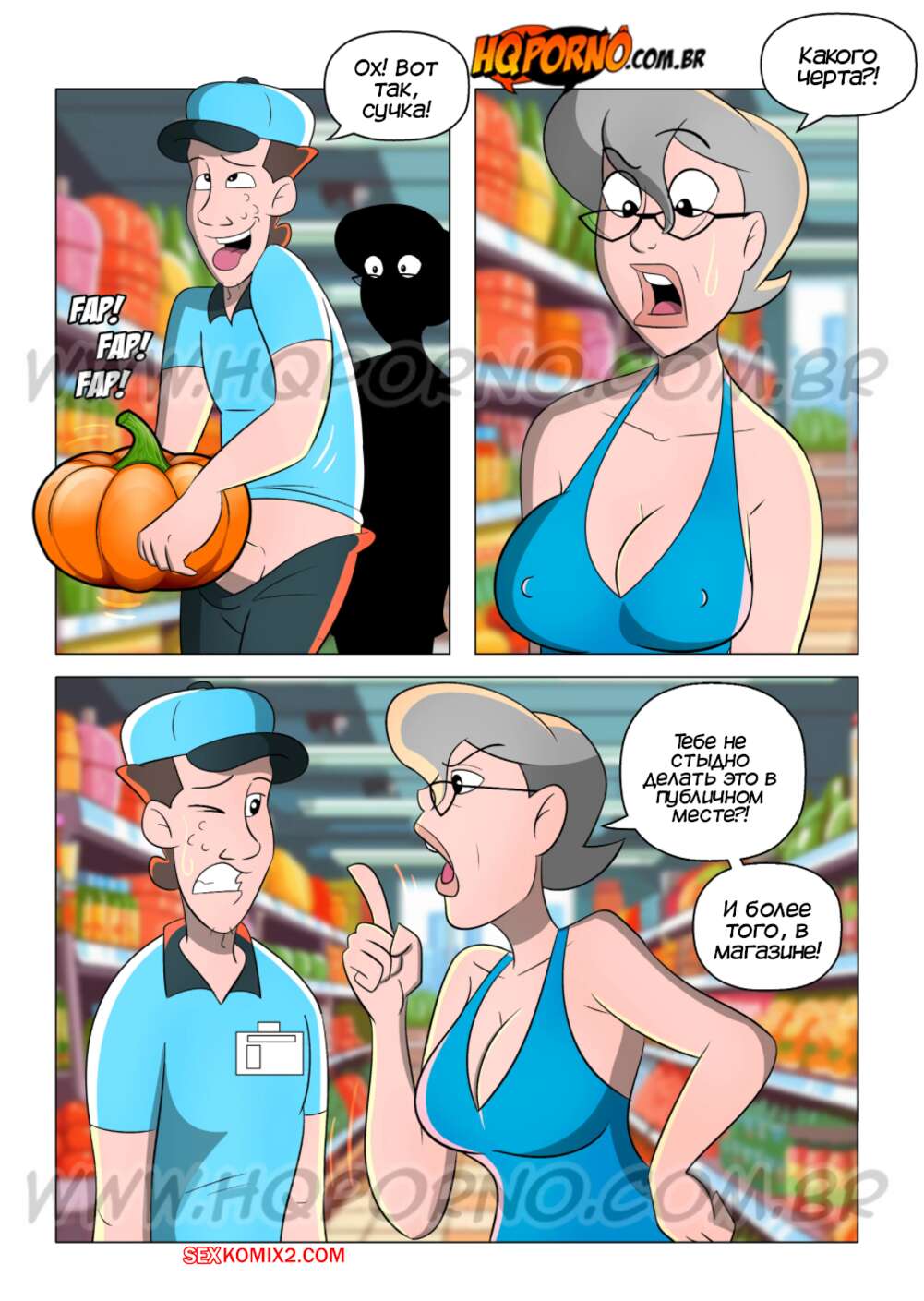 Порно комикс Мамуска, возбужденная свекровь. Часть 8. HQPorno Мамуска решила устроить семейный обед и отправилась за продуктами в магазин. Там она застала продавца за еблей тыквы и была поражена его членом. Красотка встала на колени и отсосала хуй парня, после чего дала ему себя выебать.