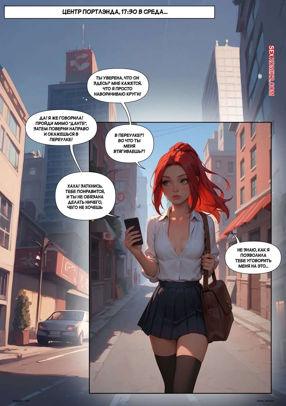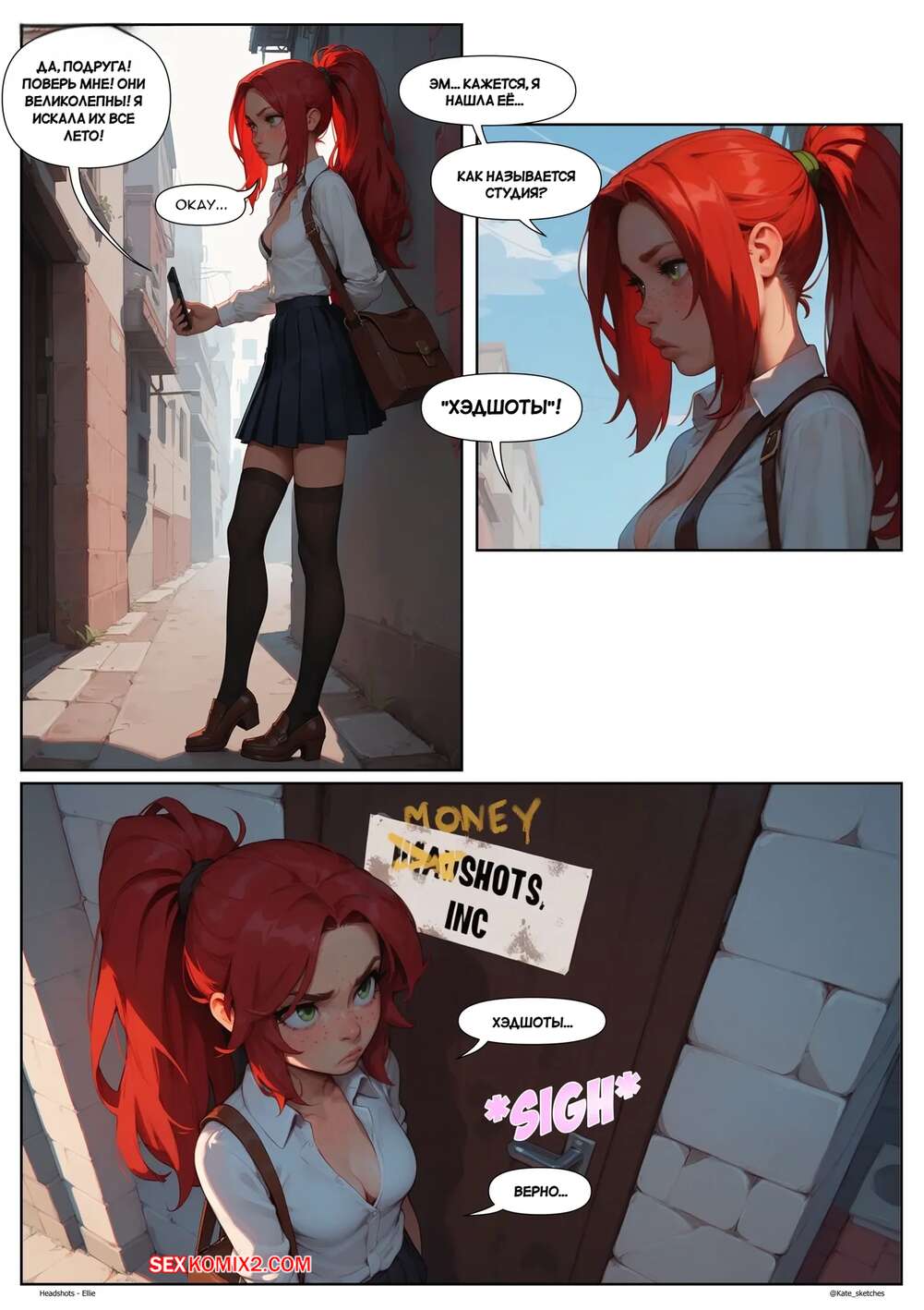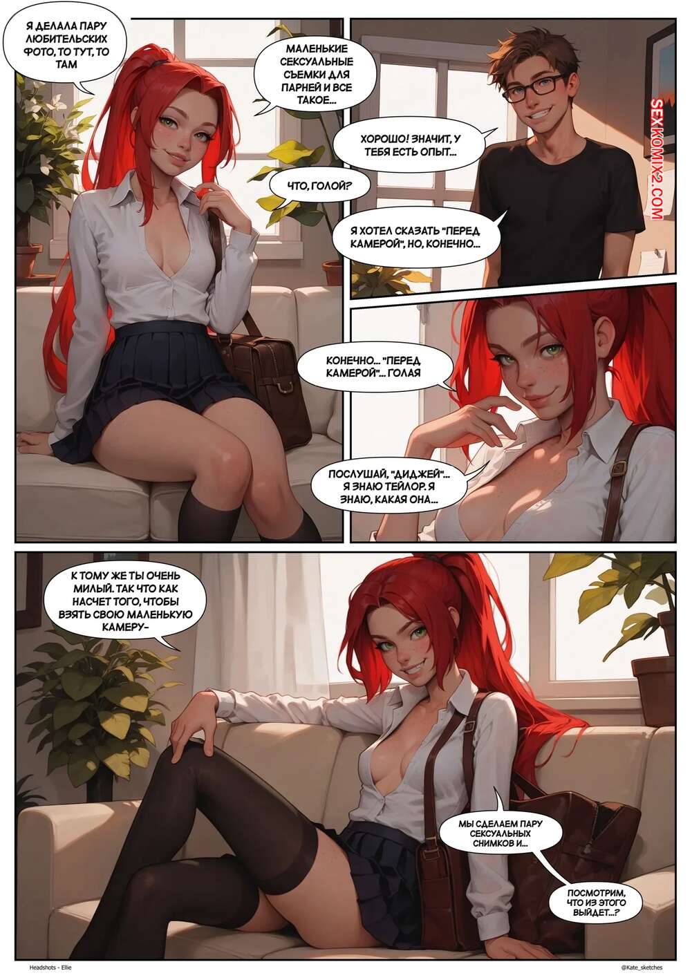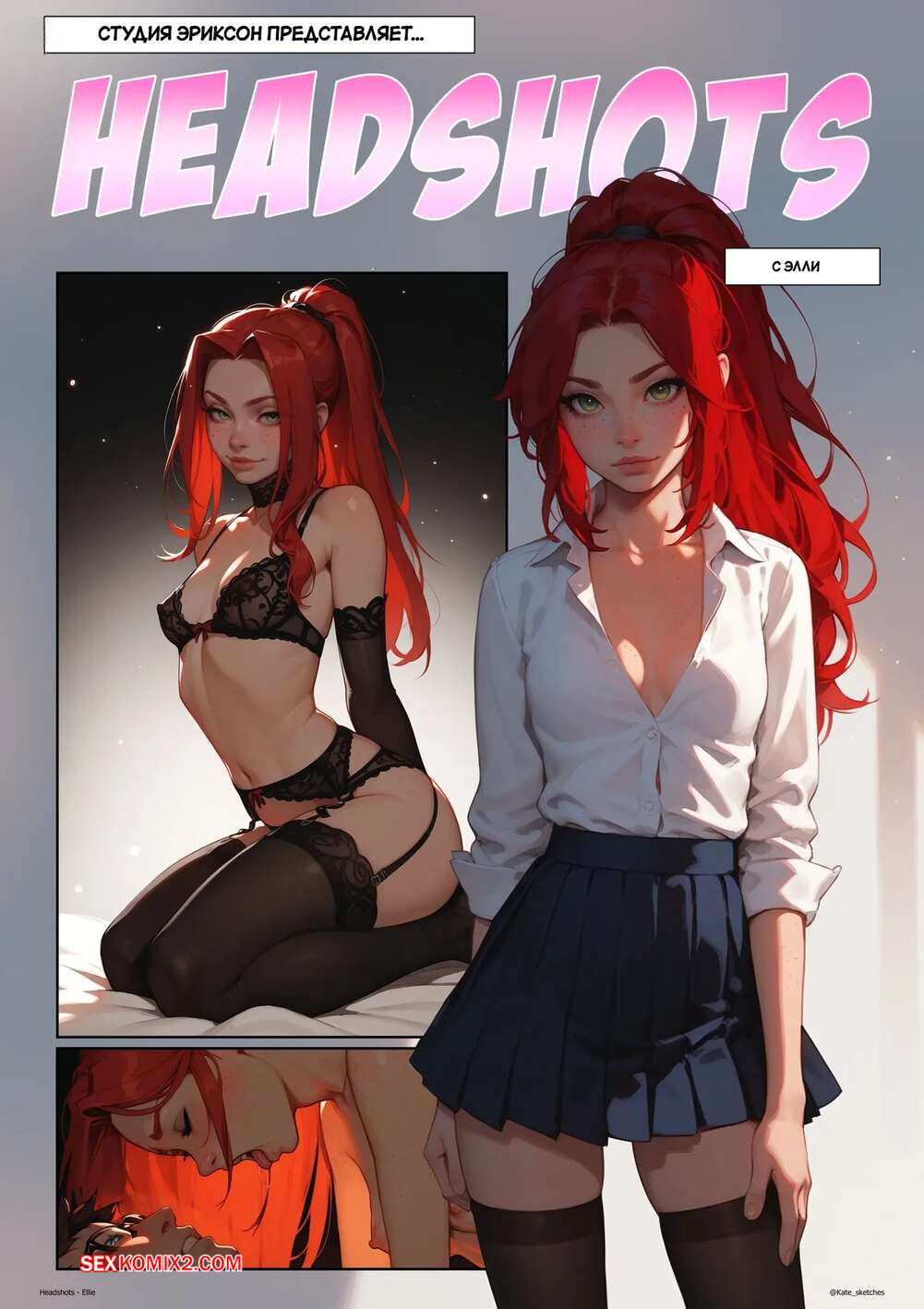 Порно комикс Хэдшоты. Элли. Headshots. Ellie. Kate Sketches. Рыжая красотка отправилась к своему дружку, желая повеселиться. Она надела сексуальное белье и возбудила парня шикарным телом, после чего дала ему себя выебать и кончить в нее.