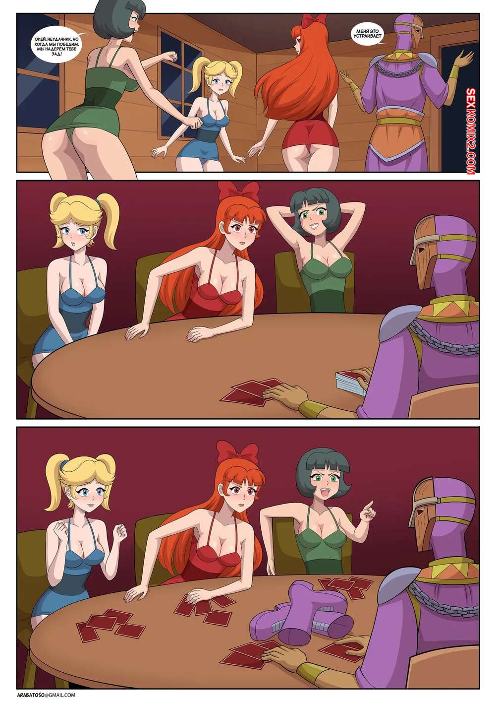 Порно комикс Девочки Пауэрпафф в скате с цепями. Arabatos. Три красотки проиграли в карточной игре и теперь им нужно обслужить член ведущего. Девушки раздеваются и сосут хуй парня, после чего он ебет их во все дырочки и оплодотворяет подруг.